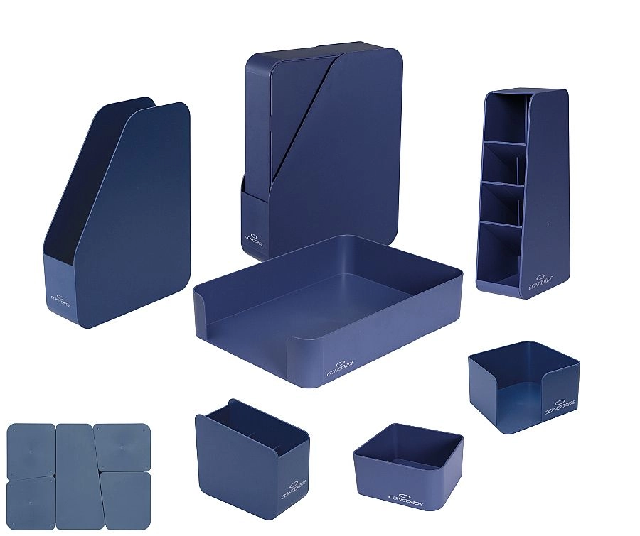 Rendezze íróasztalát a kék színű, 7 részes CONCORDE Eco készlettel, amely újrahasznosított anyagokból készült. A készlet átfogó dokumentum- és írószer-rendszerezést kínál, minimalizmust Red Dot Award 2022-díjnyertes dizájnnal, és felelős választást jelent a GRS tanúsított újrahasznosított eredetnek köszönhetően.