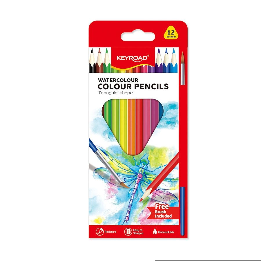 Fedezze fel a kreatív lehetőségeket a KEYROAD akvarellceruzákkal, praktikus háromszögletű kivitelben. A 12 darab fa, lakkozott ceruza 3 mm-es bélátmérővel könnyen elmosható vízzel, így finom színátmeneteket hoz létre. A csomag része egy ecset, és minden ceruzán van hely a névnek. Vízben elmosható, törésálló, könnyen faragható és ergonomikus, háromszögletű forma a kényelmes fogásért.