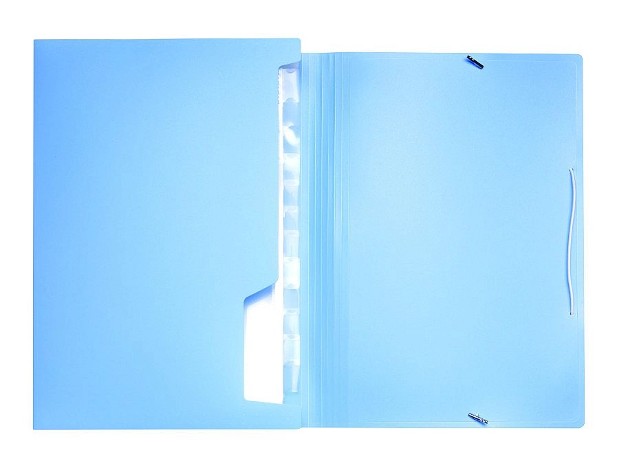 Elegáns dokumentumtartó mappa tartós polipropilénből, pasztellkék színben, praktikus gumipánttal a biztonságos záráshoz. 13 rekeszt kínál az áttekinthető rendszerezéshez A4-es és kisebb dokumentumokhoz, beleértve a betűzhető címkéket a tartalom könnyű azonosításához.