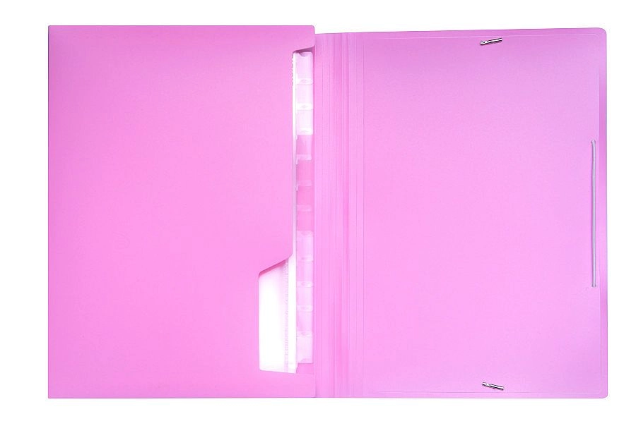 Stílusos, pasztell rózsaszín irattartó mappa áttekinthető rendszerezéshez és biztonságos tároláshoz. 13 rekeszt kínál A4 és kisebb dokumentumok számára, címkézhető betétekkel a gyors azonosításhoz és megbízható gumis zárással.