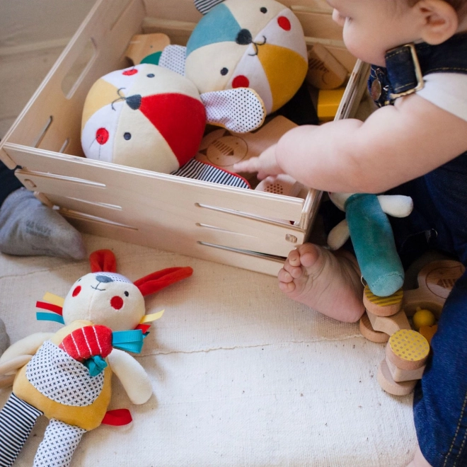 A PETIT COLLAGE dizájnja kontrasztos mintákat és élénk színeket kombinál a vizuális stimulációért, miközben a könnyű kialakítás megkönnyíti a tartást az apró kezek számára. Fenntartható választás azoknak a szülőknek, akik biztonságos és környezetbarát játékot keresnek újszülötteknek.