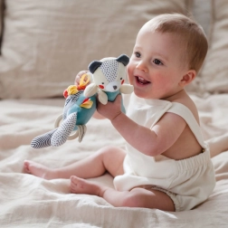 Ez a bájos mackó ötvözi a biztonságot, a fenntarthatóságot és a szórakozást. Megnyomásra finoman sípol, mozgásra csörög, ezáltal természetes módon támogatja a finommotorika fejlődését, a kéz–szem koordinációt és az érzékszervi ingereket már újszülött kortól. A GOTS tanúsítvánnyal rendelkező organikus pamut puha kivitele gyengéd az érzékeny bababőrhöz.