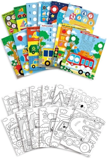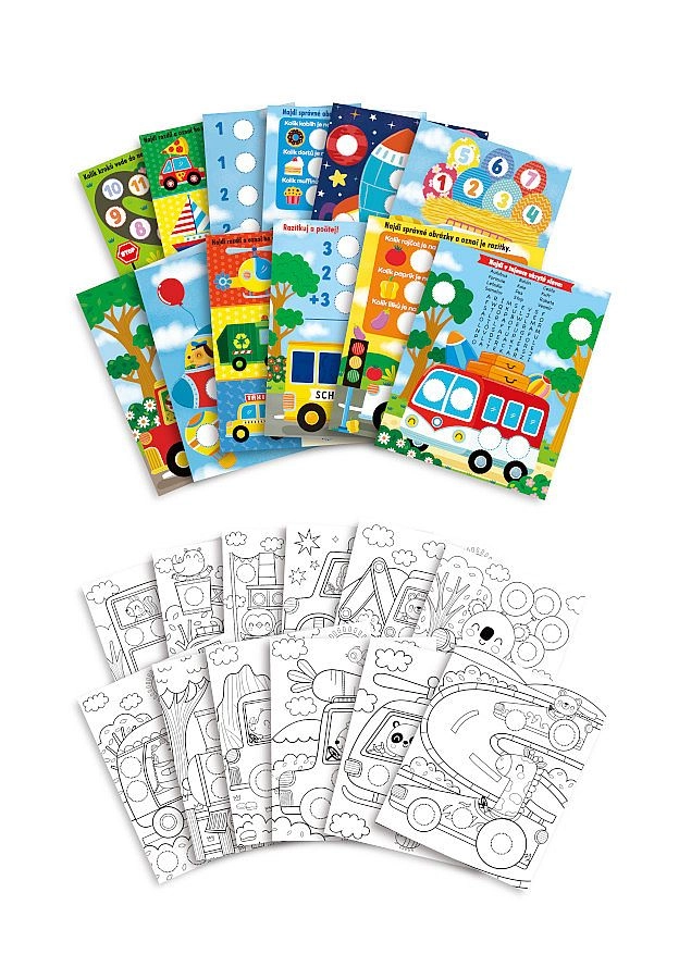 A csomag 24 oldalt tartalmaz tele szórakozással – 12 oldalt egyszerű feladatokkal és 12 oldalt színezéshez. A készletet kiegészíti 160 könnyen lehúzható matrica autós motívumokkal, 1 bélyegző az egyedi lenyomatokhoz és 6 színes zsírkréta az azonnali alkotáshoz.