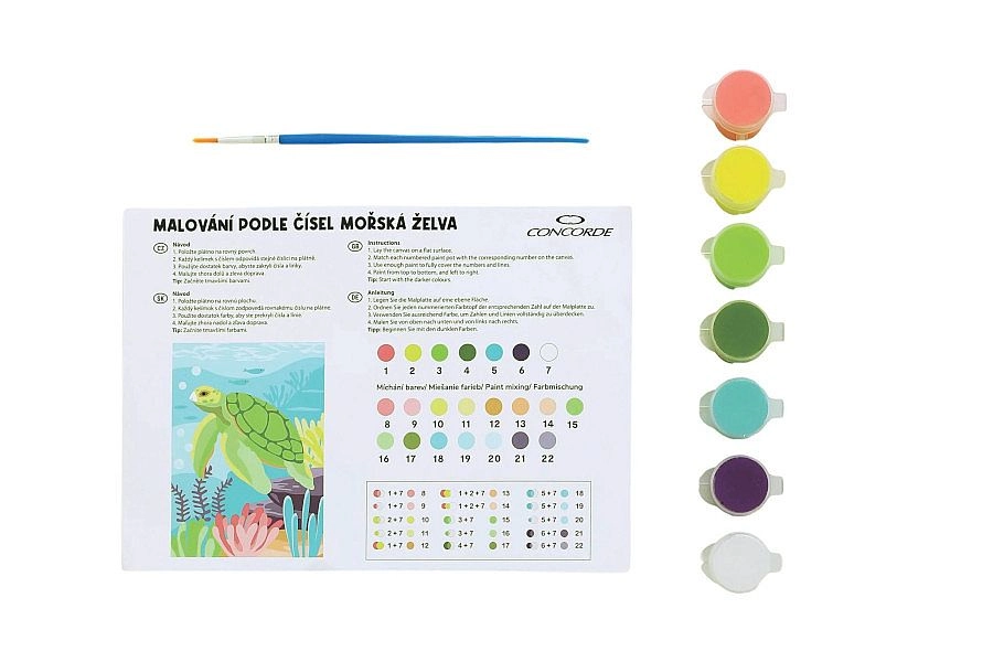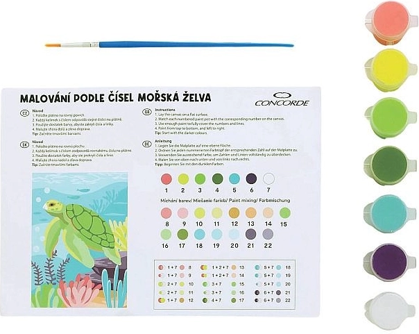 Fedezze fel a pihentető kreativitást a számozott kifestő CONCORDE készlettel tengeri teknős motívummal. Kezdőknek és haladóknak egyaránt ideális – elég követni a számozott útmutatót, és látni, ahogy gyönyörű kép születik meg Ön előtt. Mindent megtalál a csomagban: 20,3 × 28 cm vászon, 7 akrilfesték és ecset.