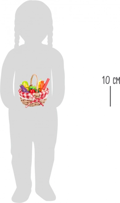 Színes gyümölcsök és zöldségek tömör fából, kockás bélésű kosárban – csábítanak a boltos és konyhás játékra.
