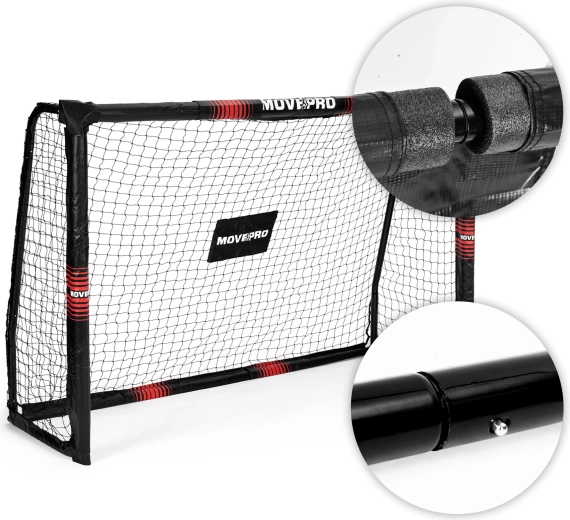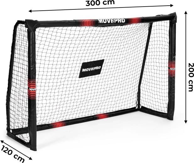 Robusztus MOVEPRO focikapu 300 × 200 × 120 cm méretben kertbe és pályára. Porszórt acél vázat, strapabíró PE hálót sűrű szövéssel, habvédőket a biztonságosabb játékért és U-alakú rögzítő tüskéket kínál a stabilitásért. A gyors click‑in rendszernek köszönhetően a kapu könnyen összeszerelhető és szállítható. Ideális gyerekeknek és felnőtteknek, pontossági edzéshez és szabadidős meccsekhez.