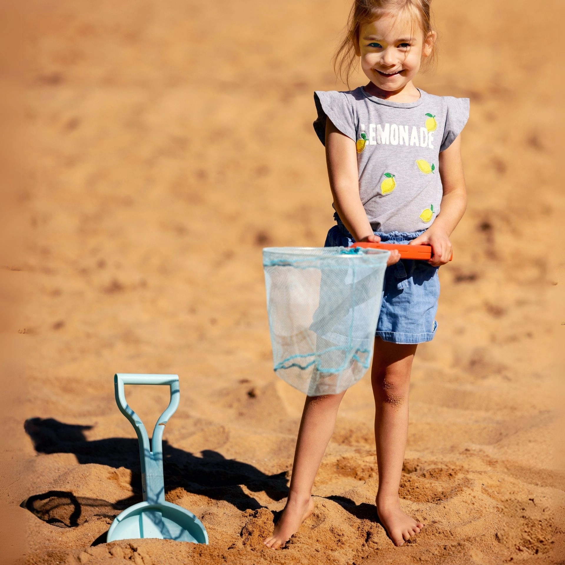 Ez a praktikus 2 az 1-ben strandkészlet remek segítő a gyerekjátékokhoz a parton, a tónál vagy a medencénél. Ötvözi a lapát funkcióját homok ásásához és formázásához a hálóéval kagylók és apró kincsek kifogásához. A teleszkópos hosszabbításnak köszönhetően 40 cm-ről 70 cm-re állítható, így könnyen igazodik a gyermek magasságához és jobb elérést kínál.