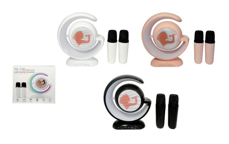 Szórakoztató, vezeték nélküli karaoke szett félhold alakú hangszóróval és két mikrofonnal, amelyből bármelyik buli show-műsor lesz. Kínál Bluetooth csatlakozást, fényhatásokat és újratölthető lítium akkumulátort a csomagban. Több színváltozat elérhető (véletlenszerűen kerül kiküldésre).