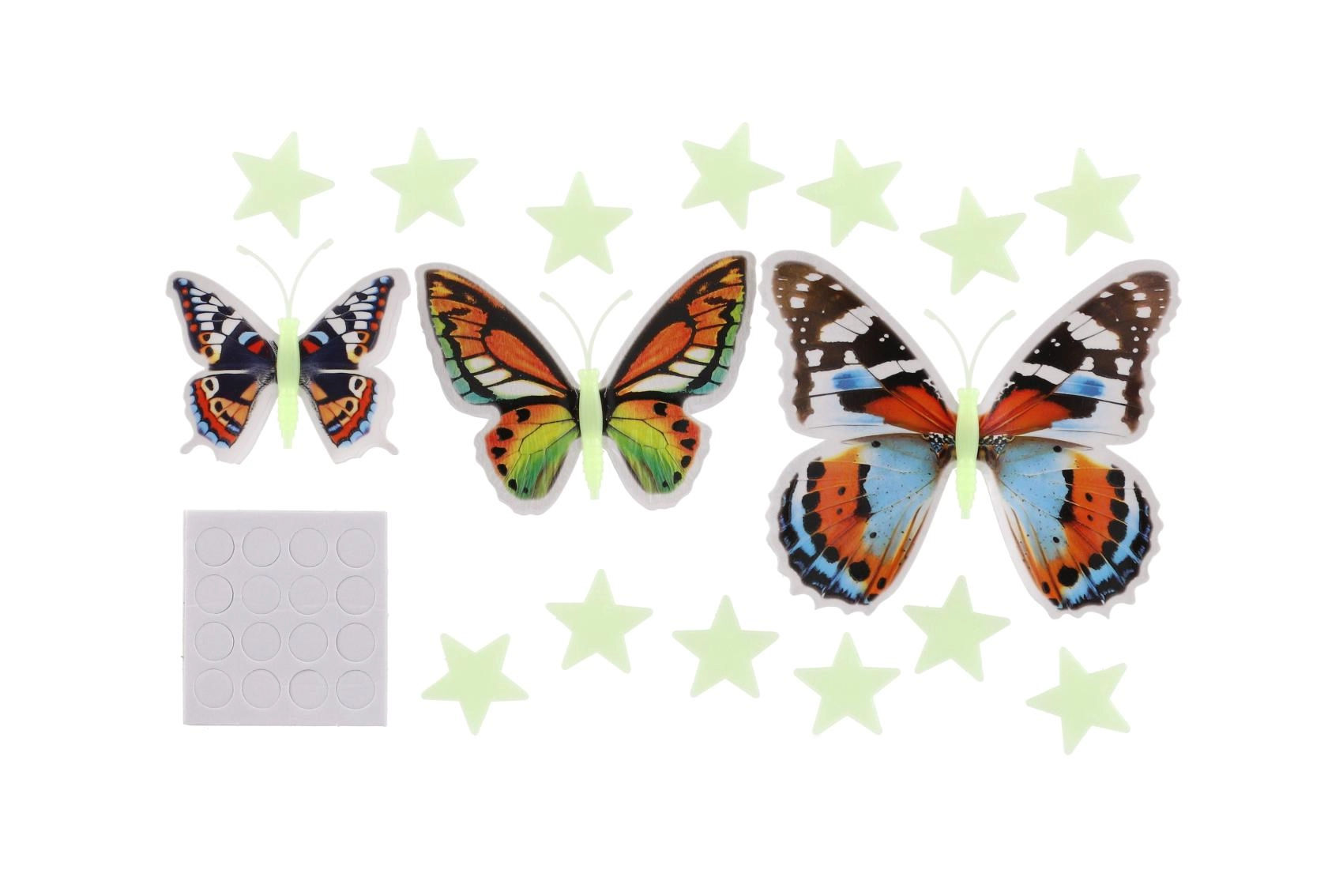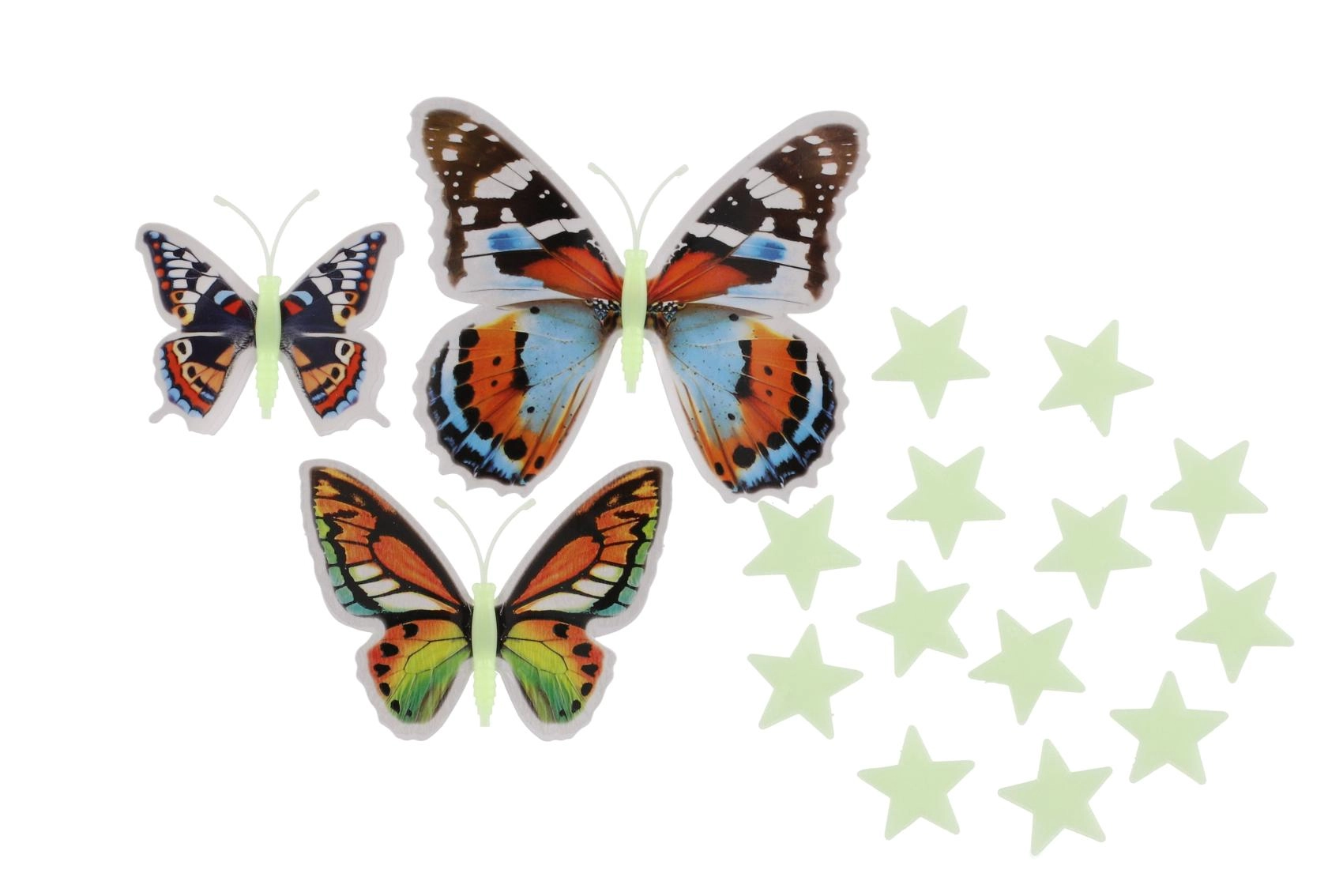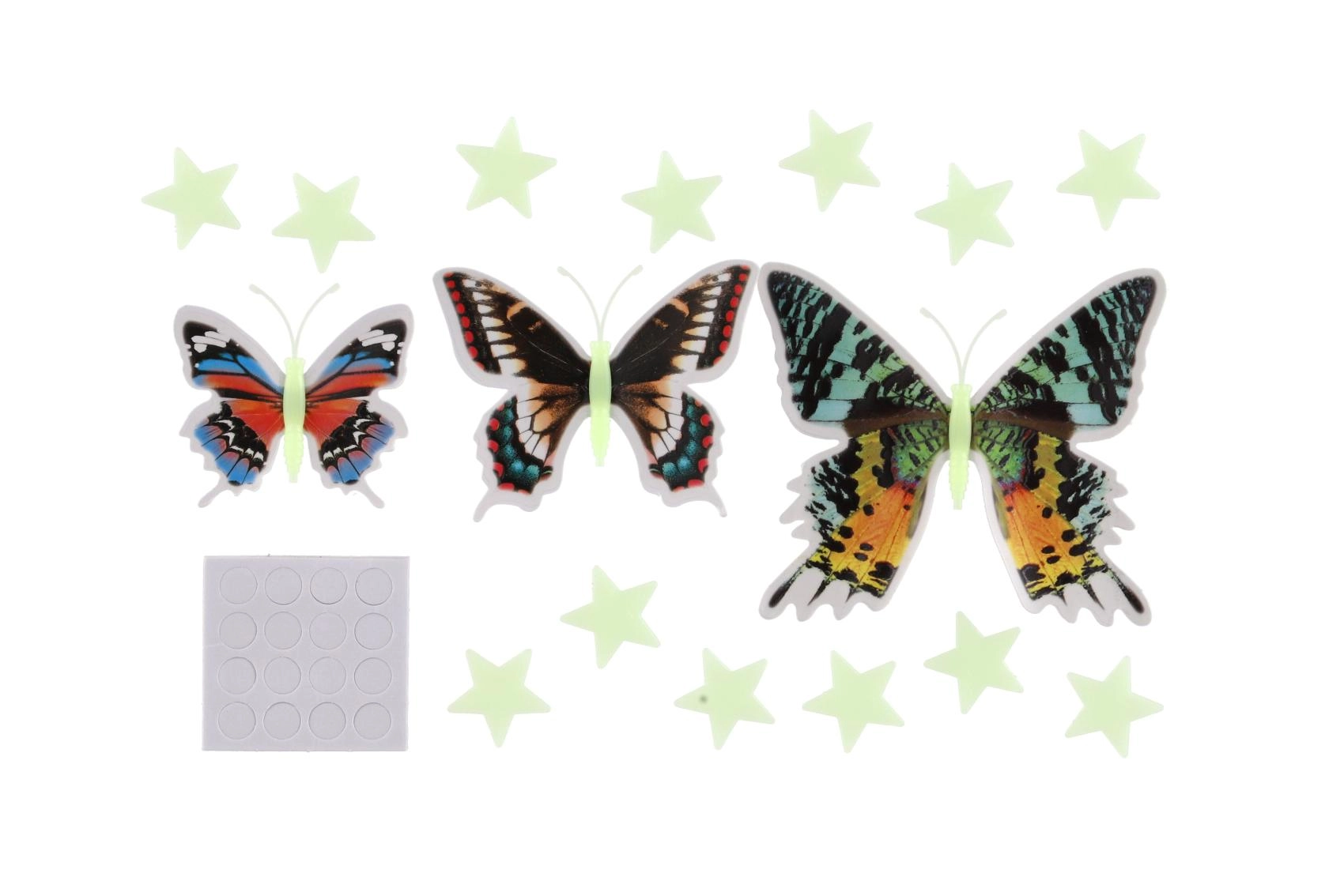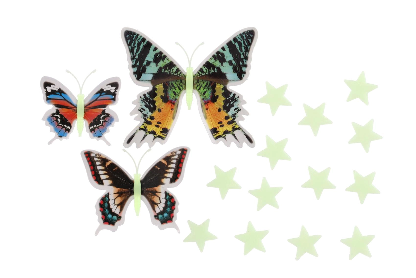 Varázslatos, színes lepkék és csillagok szettje, amelyek sötétben világítanak, és kellemes, elalvást segítő hangulatot teremtenek. Egyszerű telepítés öntapadó pontokkal, a lepkeszárnyak 3D hatása és a világító csillagok minden falat fantáziával teli, kreatív univerzummá változtatnak.
