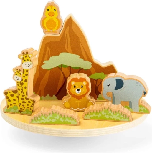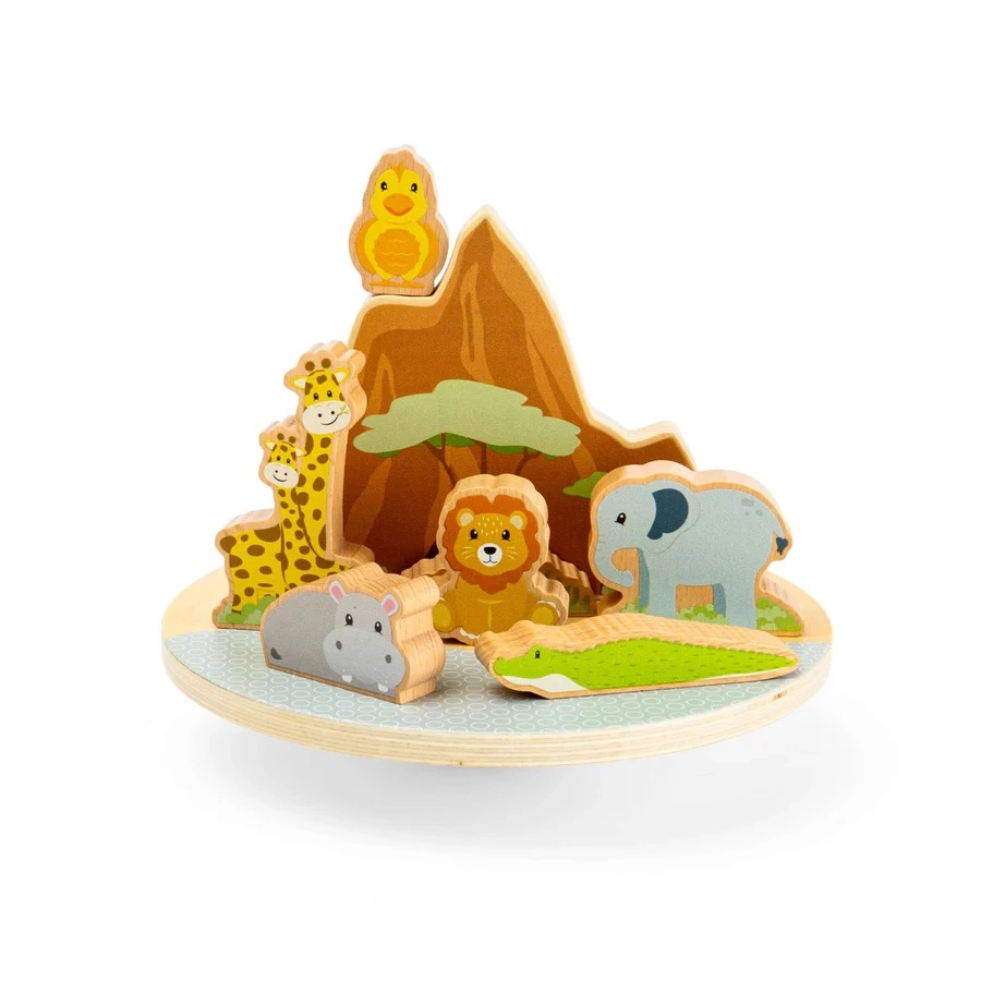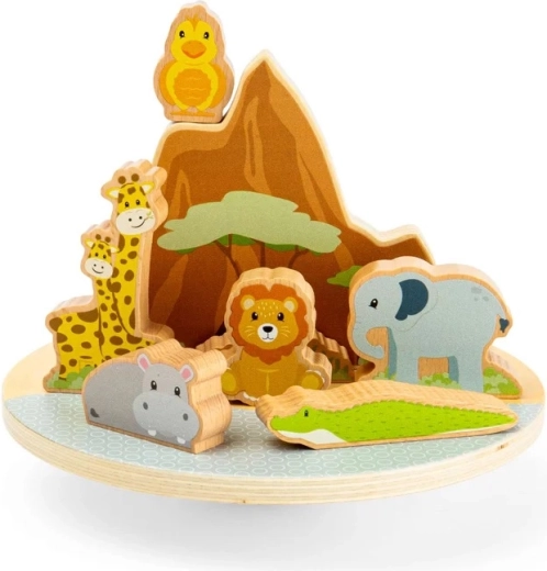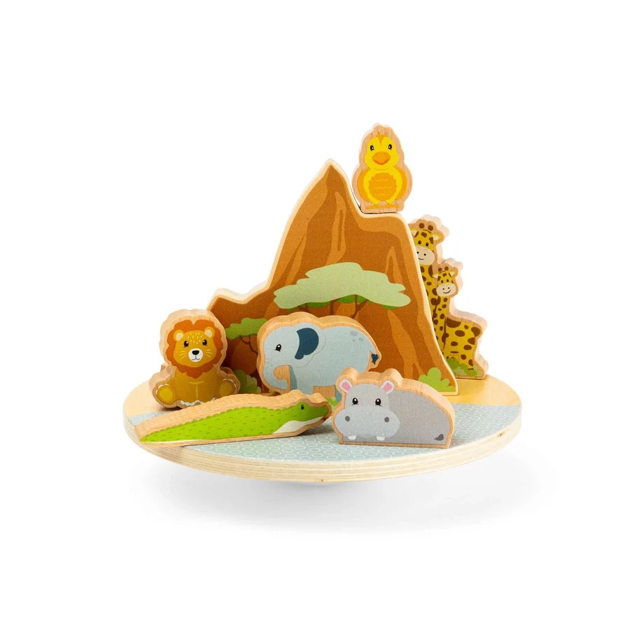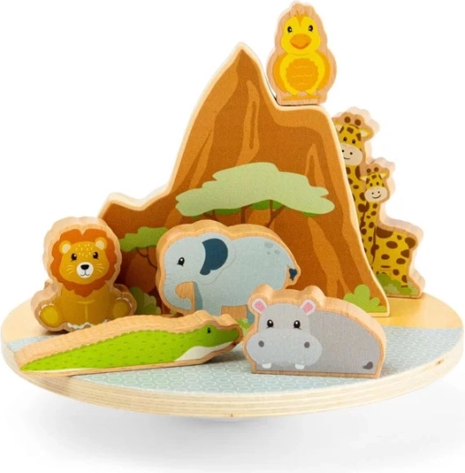A dzsungel egyensúlyozó játék egyszerre nyújt szórakozást és tanulást. A finoman billegő talapzaton próbálják meg megtalálni az egyensúlyt az oroszlánnak, elefántnak, zsiráfoknak, vízilónak, krokodilnak és madárnak. A színes, masszív figurák jól illeszkednek a gyerekek kezébe, és támogatják a kreatív történetmesélést és a logikus gondolkodást.
