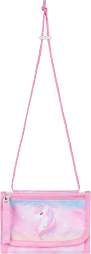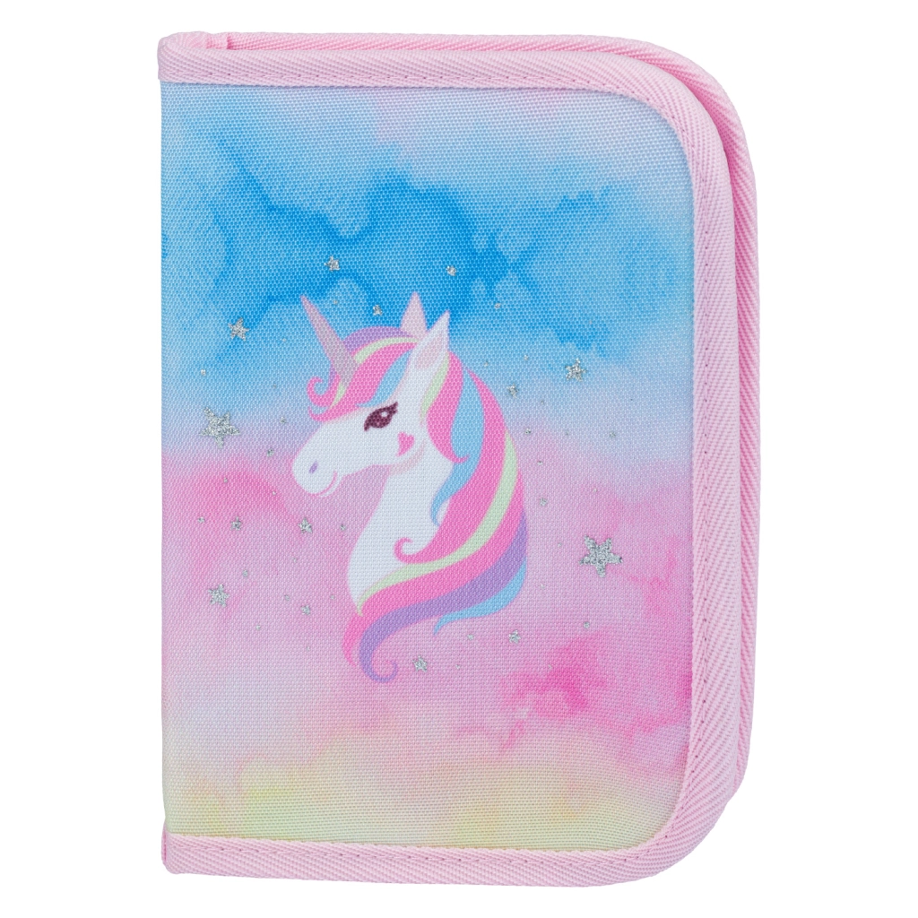 Egyszintes tolltartó YKK cipzárral, tornazsák elülső cipzáras zsebbel és füllel a rögzítéshez, mosható kötény két zsebbel és nyakba akasztható pénztárca – mind egységes unikornis dizájnban.