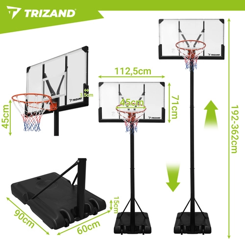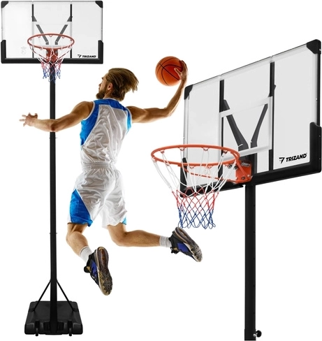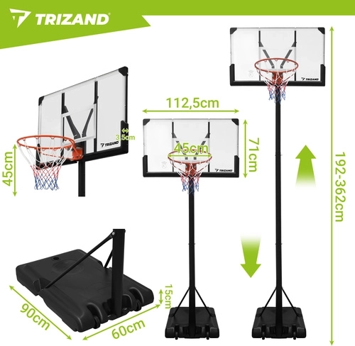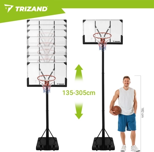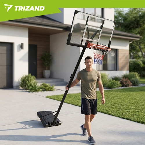 Élvezze az edzést és a játékot bárhol a TRIZAND hordozható kosárlabda palánkkal. A zökkenőmentesen állítható 135–305 cm-es magasságnak, a stabil szerkezetnek és a kerekekkel ellátott mobil talapzatnak köszönhetően a palánk könnyen igazítható gyerekekhez és felnőttekhez. A nagy hátlap és a 45 cm-es szabványos gyűrű valósághű játékélményt biztosít otthon, a kertben vagy az autóbejárón.