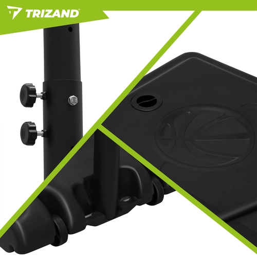 A TRIZAND kosárlabda palánk teljes értékű edzőszett rekreációs játékhoz és mindennapi gyakorláshoz. A 135–305 cm között állítható magasság együtt nő a játékosokkal, és megfelelő beállítást tesz lehetővé a kis kezdőknek és a felnőtteknek egyaránt. A masszív acélszerkezet és a vízzel vagy homokkal terhelhető talapzat biztonságos stabilitást nyújt dobásoknál és lepattanóknál.