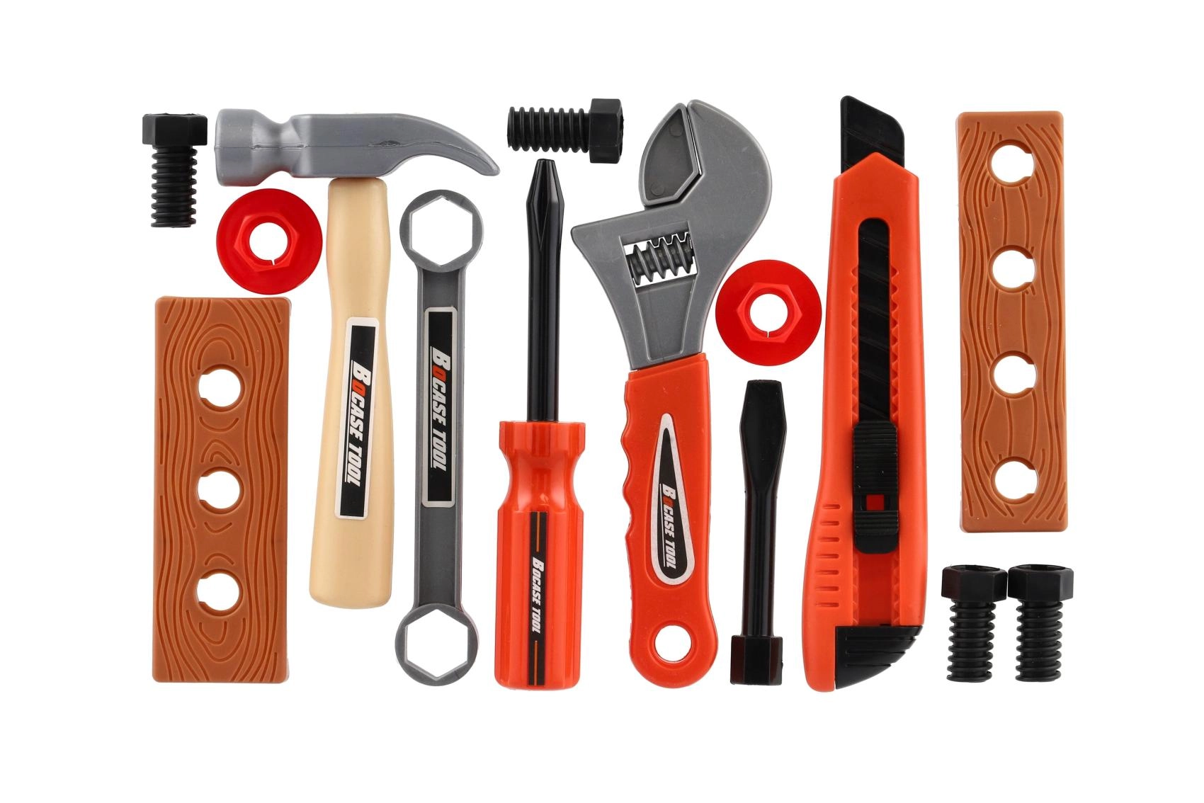Kalapács, állítható és csőkulcs, csavarhúzók, kés, csavarok és anyák, perforált lapocskák – minden, ami a csavarozás és szerelés gyakorlásához kell.