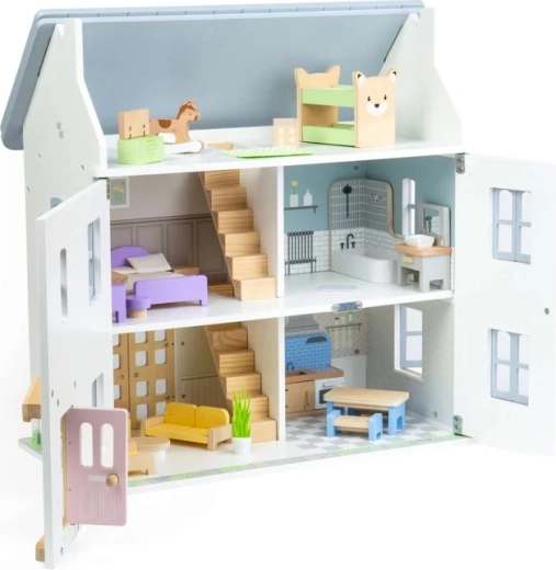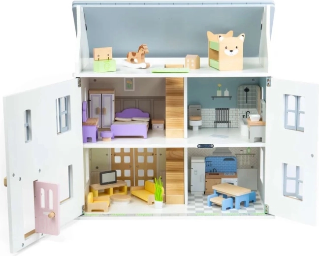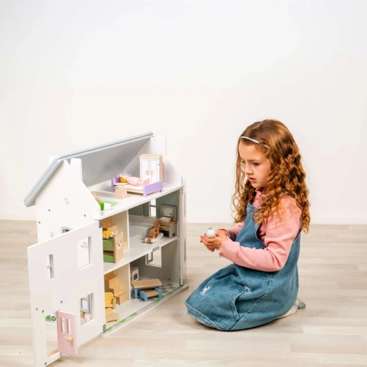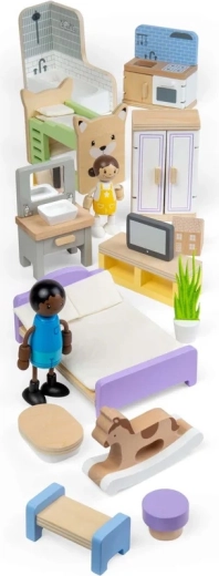 Ez a sokoldalú szett mindent kínál, ami egy babaház berendezéséhez szükséges – a kanapétól és az asztaltól kezdve a konyhai és fürdőszobai elemekig, egészen az ágyakig, szekrényig és a gyerekszobai kiegészítőkig. Gondos kidolgozásának és kellemes pasztell színeinek köszönhetően a bútorok természetes hatásúak és játékra csábítanak.