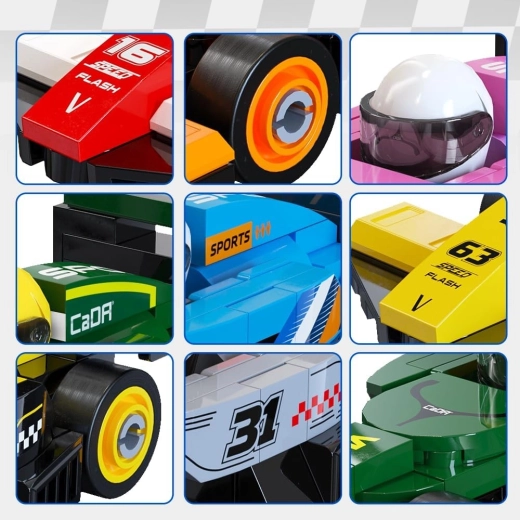 Ez a dizájnos készlet 8 különböző mini versenyegyülésest tartalmaz, egyenként körülbelül 70 darabbal. Összeépítés után kb. 10 × 4 × 3 cm méretű, kompakt modellek születnek, amelyek kiválóan gurulnak sík felületen, és kollekcióként is remekül mutatnak a polcon. Az elemek kompatibilisek más CADA szettekkel, így a járművek tovább alakíthatók és kombinálhatók.