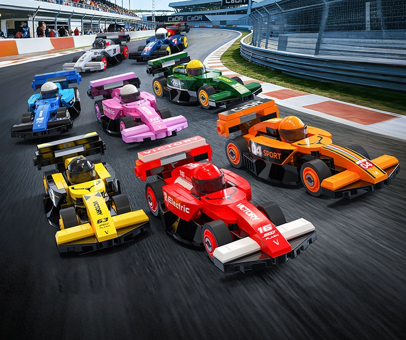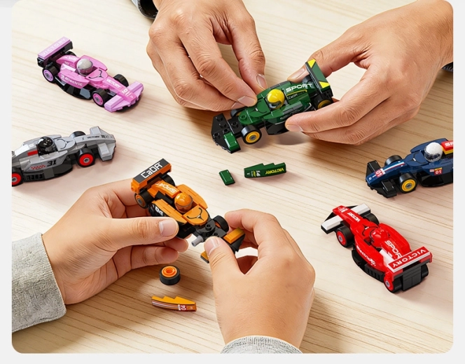 Építse meg a teljes kollekciót – nyolc különböző mini versenyautót dinamikus formákkal, szárnyakkal és mintákkal. Remek játékhoz és kiállításhoz.