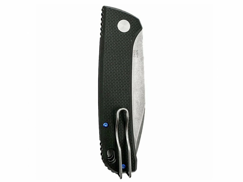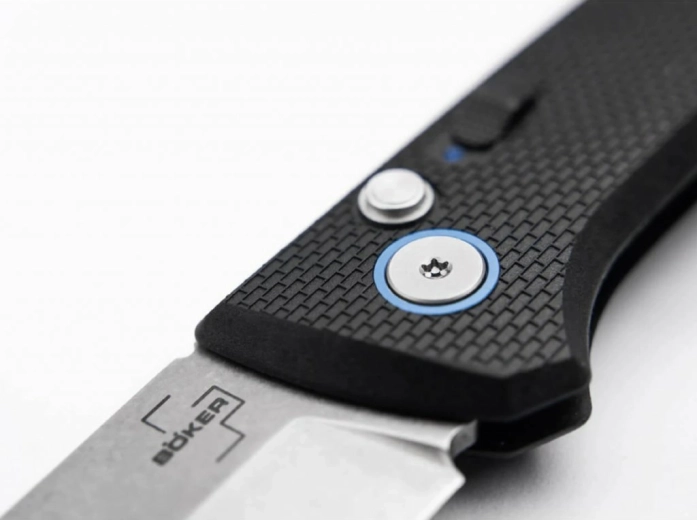 A könnyű és tartós Grivory markolat texturált felülete biztosan ül a kézben. A gombnyomásra működő automata nyitás gyors és sima, míg a kettős biztosítás minimalizálja a véletlen kinyílás kockázatát. A kék eloxált részletek prémium megjelenést adnak, a drótklipsz pedig diszkrét zsebben hordást tesz lehetővé.