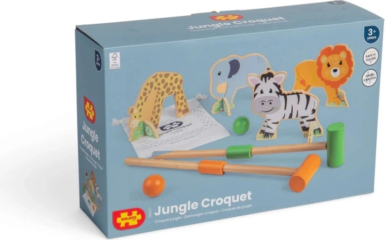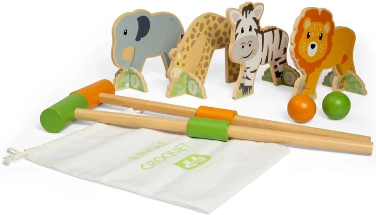 A Dzsungel gyerek krokett időtlen szórakozást hoz modern köntösben. Négy vidám állatos kapu (oroszlán, víziló, elefánt, zsiráf), két színes golyó és két masszív ütő alkotja a tökéletes készletet beltéri és kültéri játékhoz. Az ütők két részre csavarhatók, minden könnyen elfér a mellékelt pamut tasakban – ideális utazáshoz és a gyors elpakoláshoz.