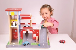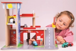 A gyerekek rengeteg szórakozást találnak a háromszintes garázs minden emeletén, parkolóval. A földszinten az autó felhajthat a működő felvonóra, majd felmehet egészen a második emeletre és leparkolhat. A földszinten szerviz, autómosó és benzinkút található. Az első emeletről az autók a felvonóval vagy a rámpán távozhatnak, de vigyázat, meg kell várni, amíg a sorompó felemelkedik! A garázs legmagasabb pontja a heliport. Ez a garázs mindent tud, amire egy kis sofőrnek szüksége van, hogy eljusson A pontból B pontba. Támogatja a kreativitást és a képzelőerőt. Fejleszti a szem-kéz koordinációt, a finommotorikát és az ügyességet. Kiegészíthető Bigjigs Toys és Bigjigs Rail kisautókkal. Felelős forrásból származó, minőségi anyagokból készült. Főbb jellemzők: 3 szint parkolóval és heliporttal, működő felvonó, szerviz, autómosó és benzinkút a földszinten.