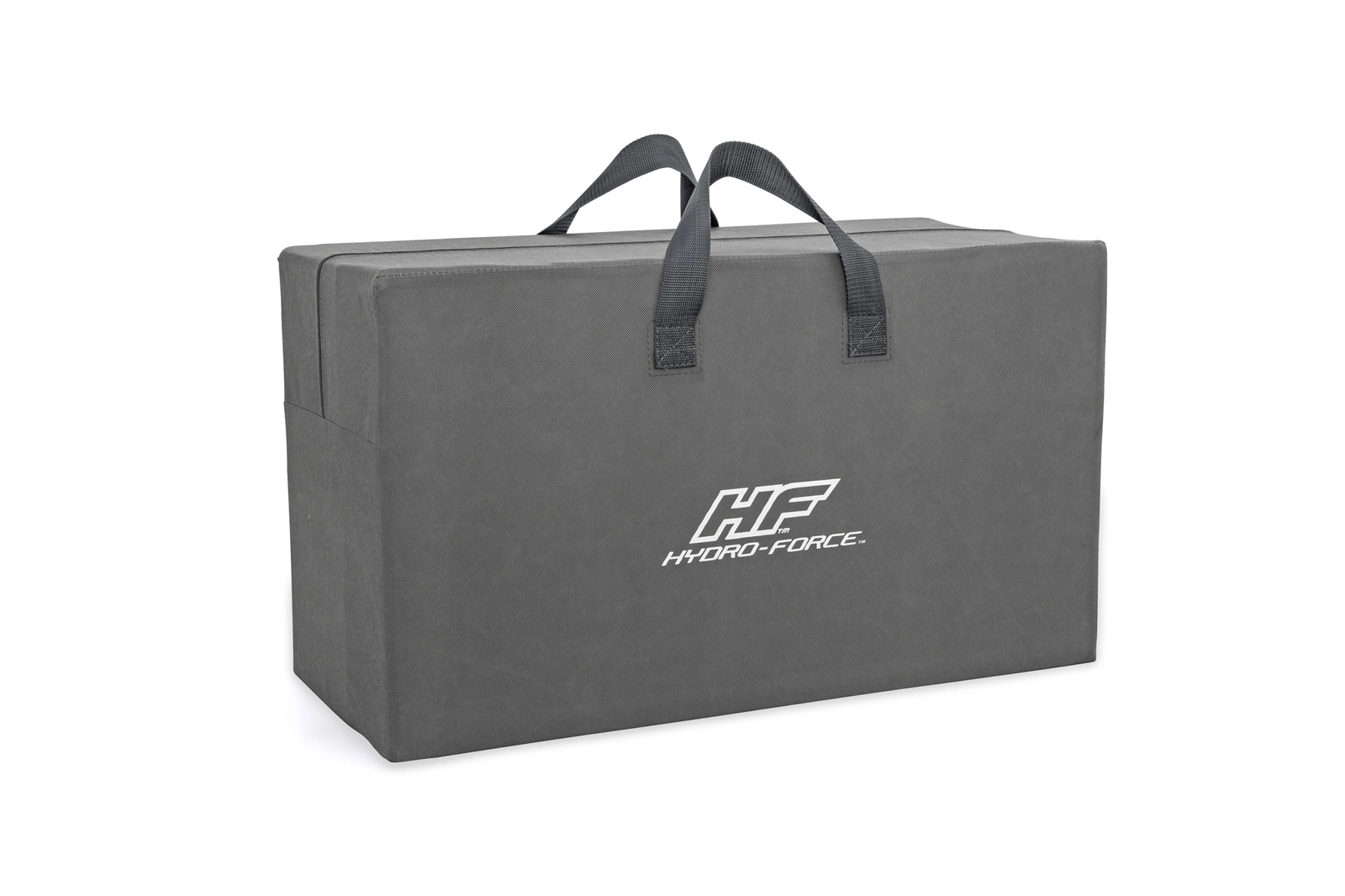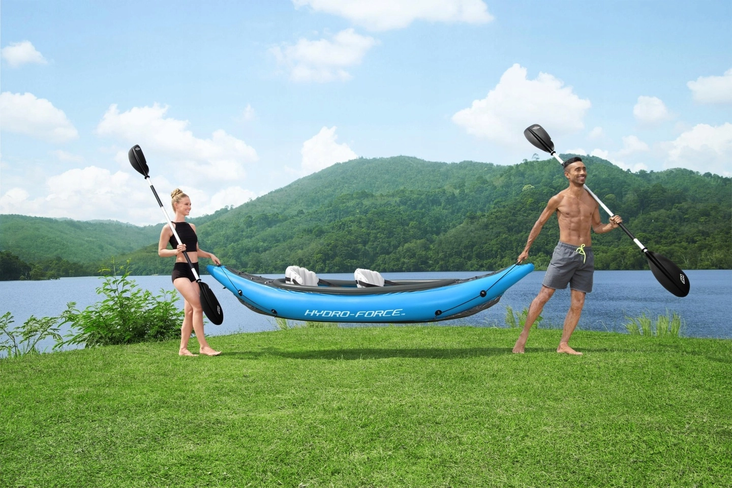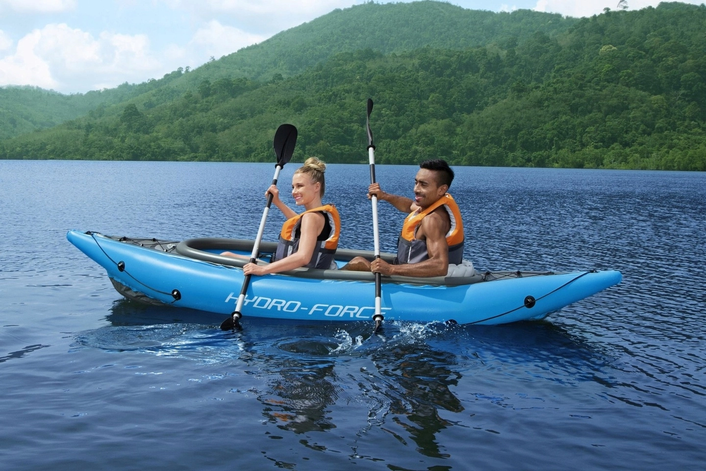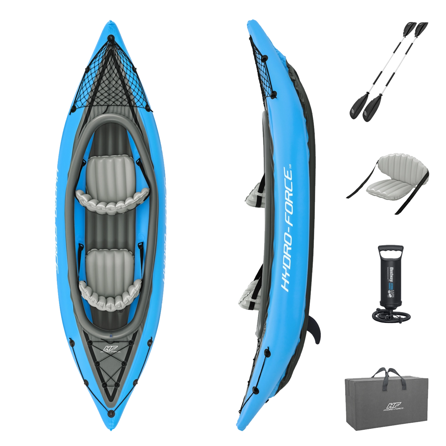 A Hydro‑Force Cove Champion X2 felfújható kajak ideális szabadidős evezéshez tavakon és nyugodt folyókon. A doboz mindent tartalmaz, amire szükséged van: 2 kétlapátos evező, Air Hammer kézipumpa, 2 állítható, felfújható háttámlás ülés és szállítótáska. A masszív, többrétegű felépítés és a merev felfújható padló stabilitást és biztonságérzetet ad a vízen.