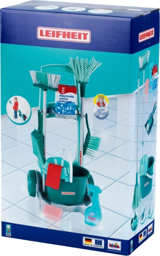A hivatalos LEIFHEIT licencű gyermek takarítószett úgy néz ki, mint az igazi eszközök, mégis biztonságosan a kis segítők igényeire van szabva. A masszív, kerekes kocsi szerszámtartókkal, polccal a vödörnek és hellyel a „tisztítós doboznak” rendelkezik, így a gyerekek úgy érezhetik magukat, mintha valóban takarítanának.