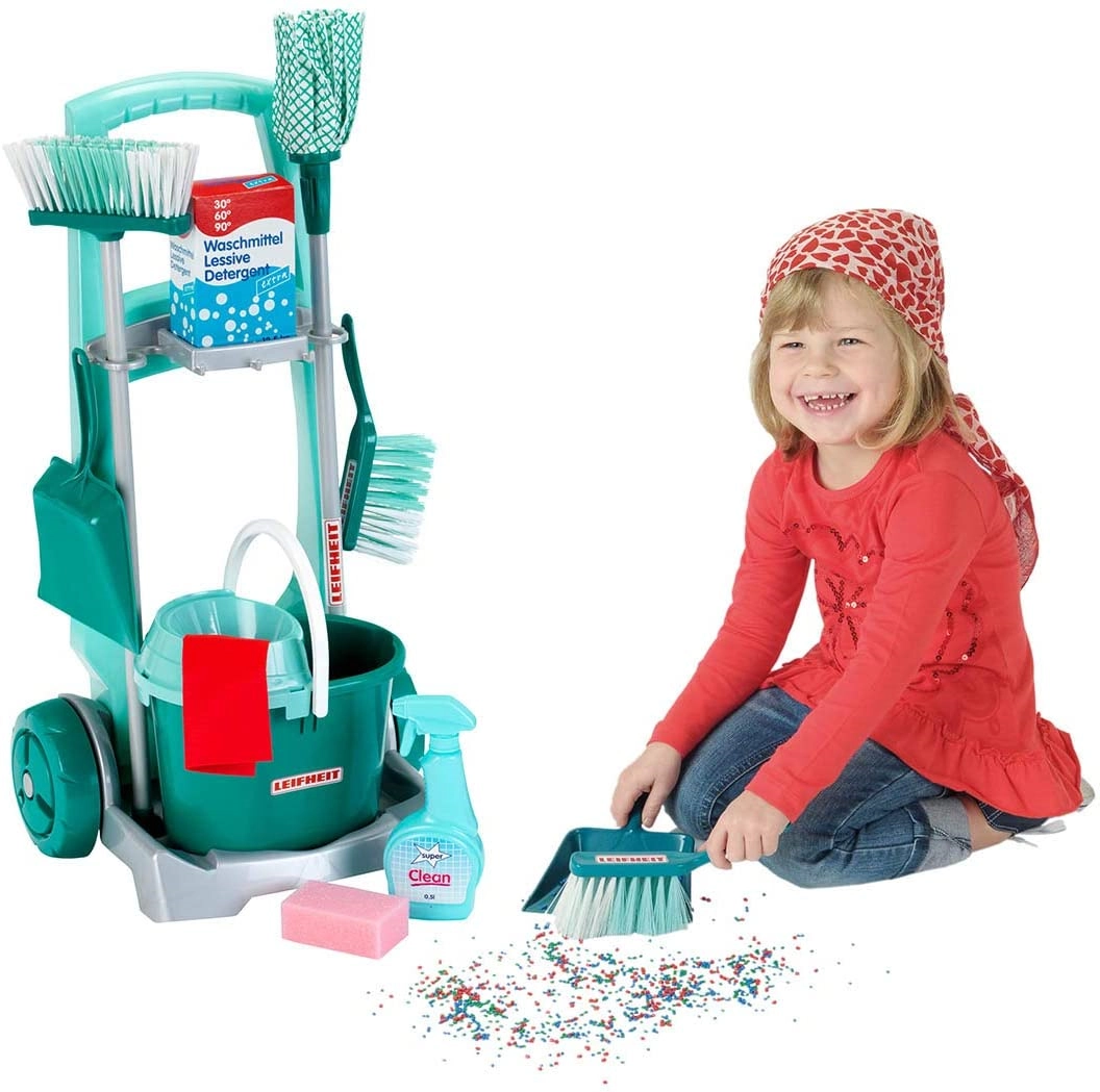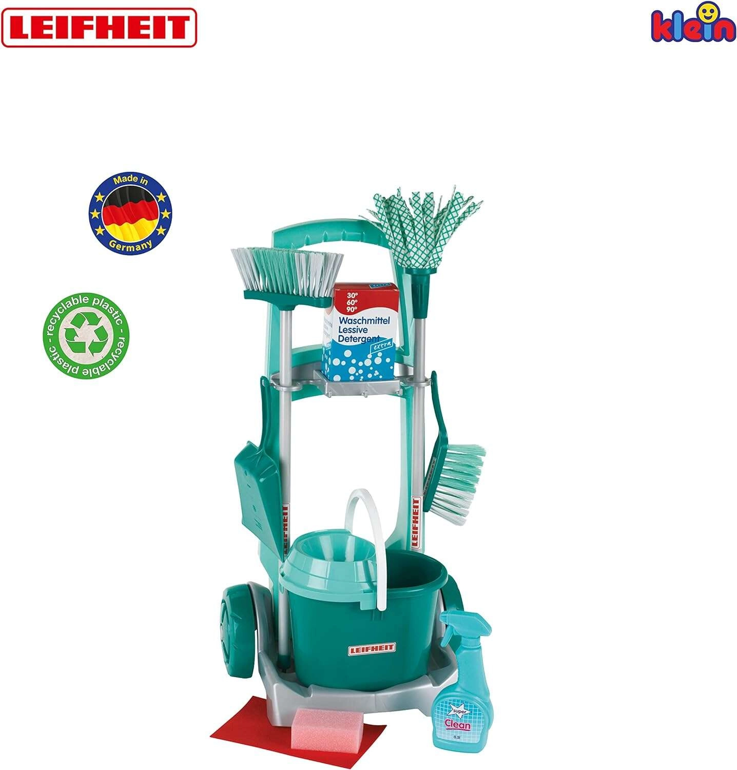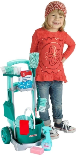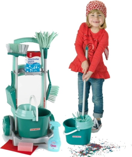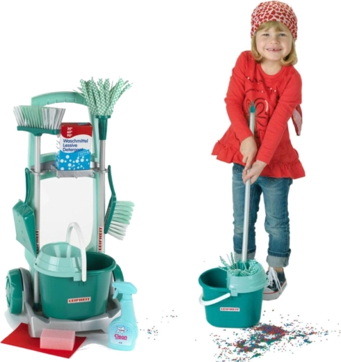 Stílusos, LEIFHEIT licenccel rendelkező gyermek takarítókocsi a KLEIN márkától, amely valósághű háztartási szerepjátékot kínál. A szett tartalmaz gurulós kocsit, vödröt csavaróval, felmosót, seprűt, kézi seprűt lapáttal és további kiegészítőket a valódi takarítás utánzásához. A könnyű anyagoknak és az átgondolt tartóknak köszönhetően minden könnyen kezelhető és azonnal játékra kész. Remek a motorika fejlesztésére, a felelősség tanulására és a kreatív szerepjátékra 3 éves kortól.
