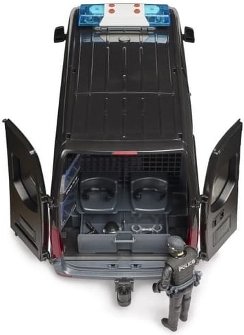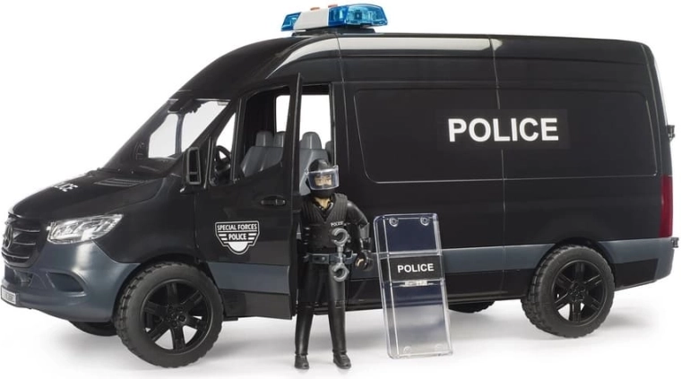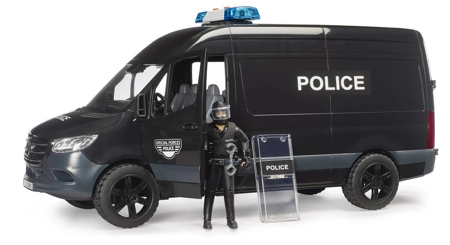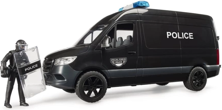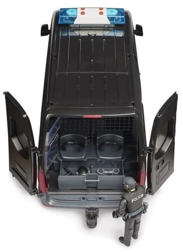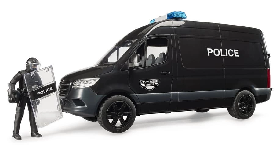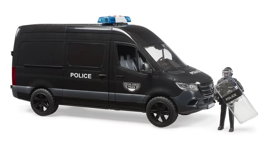 A MERSEDES‑BENZ Sprinter rendőrautó élethűen kidolgozott modellje hiteles bevetési jeleneteket kínál a gyerekeknek. A jármű toló oldalsó ajtóval, nyitható fülkével és átlátszó, strapabíró műanyag ablakokkal rendelkezik. A csomag tartalmaz egy rohamrendőr figurát pajzzsal és kiegészítőkkel az akciódús szerepjátékhoz.