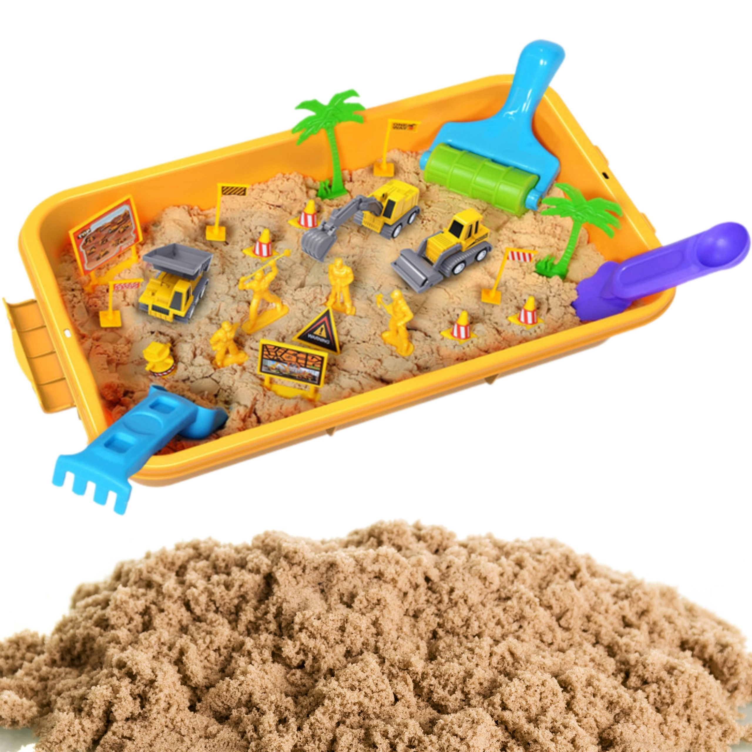 - Csomag tartalma: sárga bőrönd, 1 000 g kinetikus homok (természetes szín), 3 építőjármű, 4 munkásfigura, közlekedési és figyelmeztető elemek (kúpok, korlátok), 2 fa (pálma), homokeszközök: lapát, spatula/mini gereblye, kézi henger.