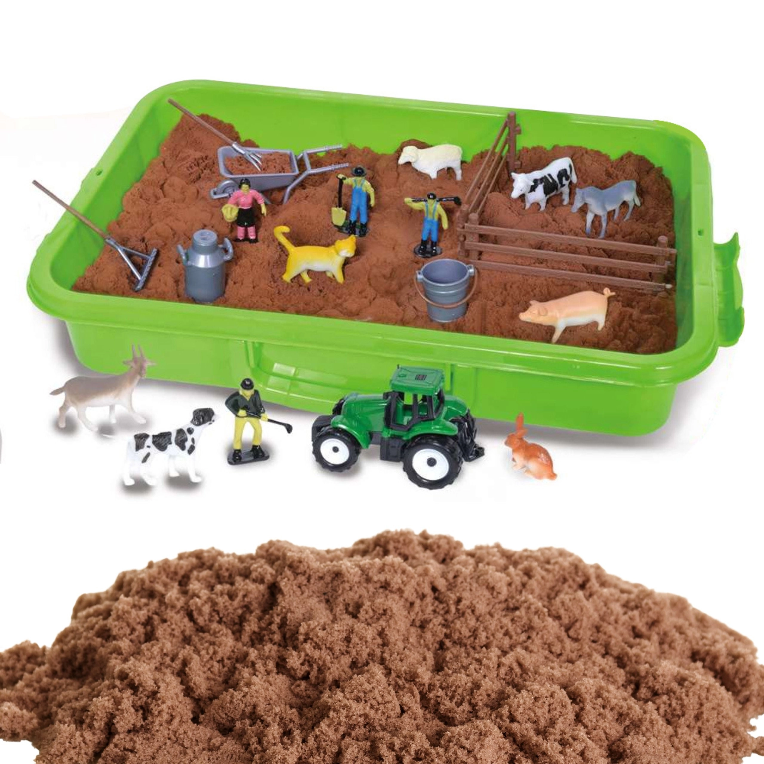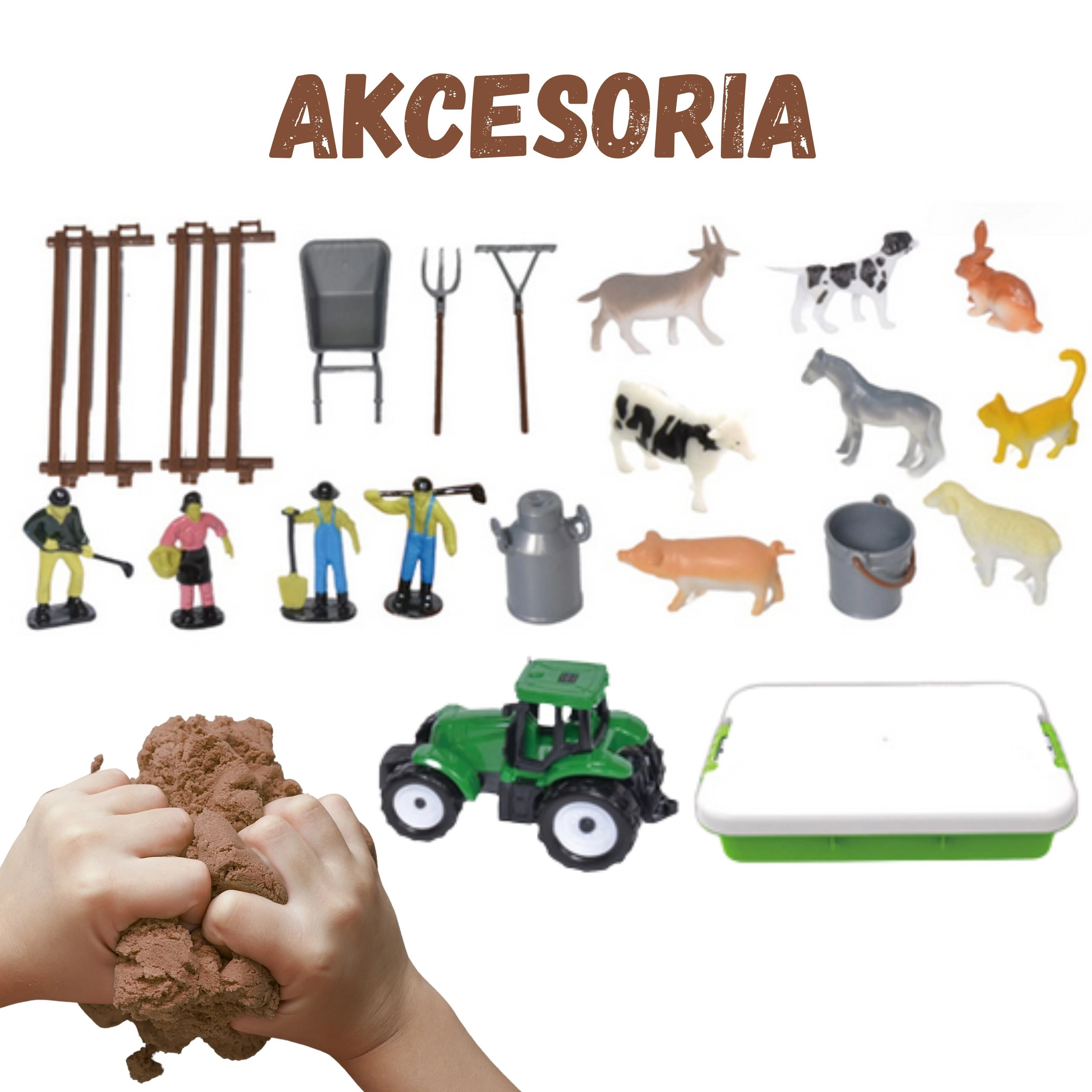 - Bőrönd/kád, 1500 g kinetikus homok, zöld traktor, 4 gazdafigura, állatfigurák (ló, tehén, bárány, malac, kecske, kutya, macska, nyúl), 2 darab kerítés, talicska, villa, gereblye, kanna/tejeskanna, vödör, 6 zip tasak