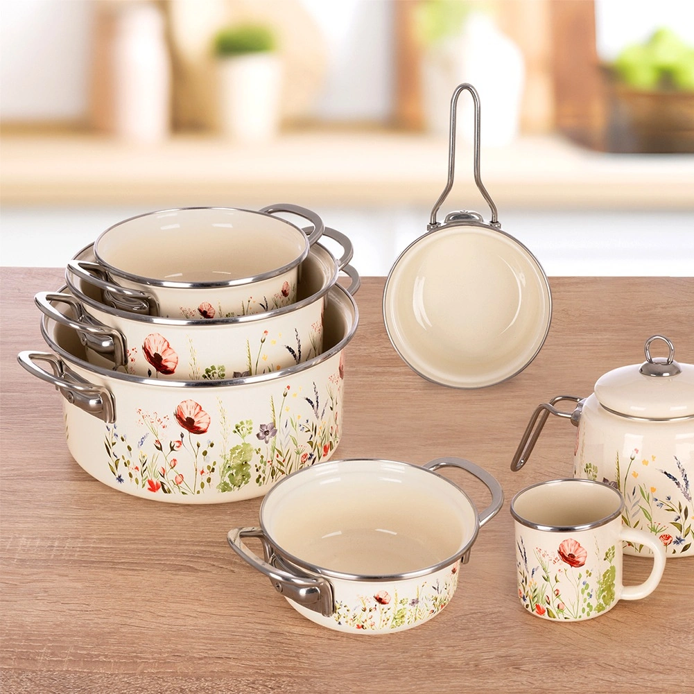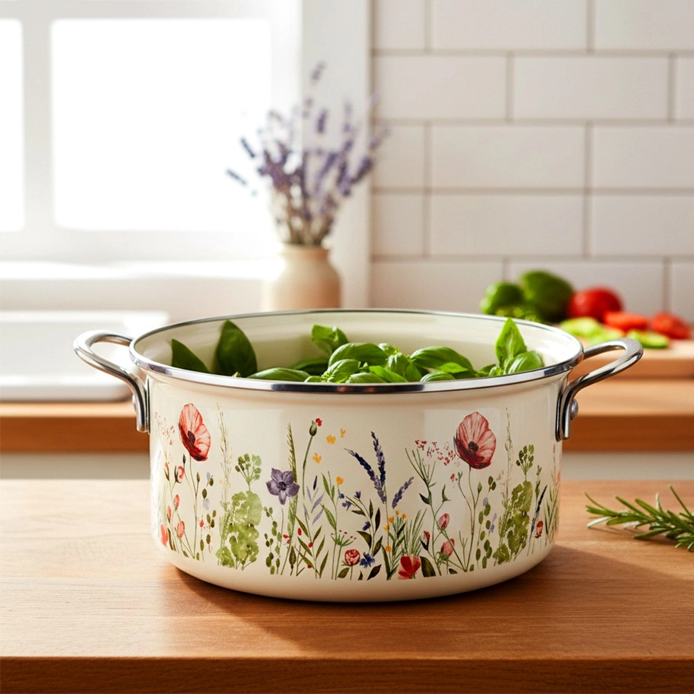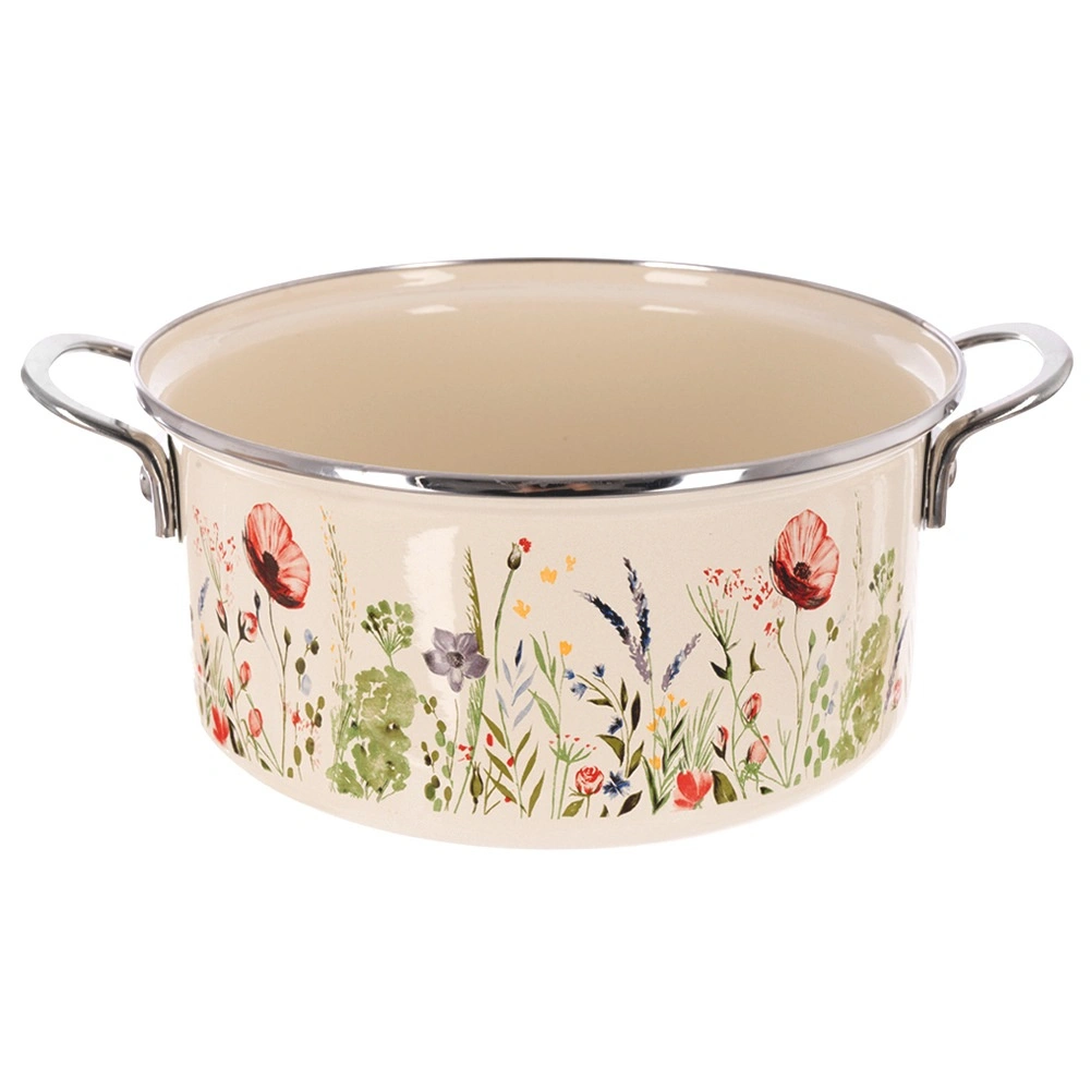 A közkedvelt, retro stílusú fazék tartós zománcozott acélt ötvöz a mezei virágmintával. Kiválóan alkalmas mindennapi levesek, mártások és köretek elkészítésére, és a széles peremnek köszönhetően kényelmes a keverés és a tálalás közvetlenül az asztalra.