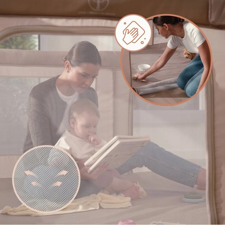 A lélegző hálós oldalfalak biztosítják a jó rálátást és a levegő keringését. A puha habbal párnázott, megerősített felső perem védi a gyermeket játék közben és az első lépések során.