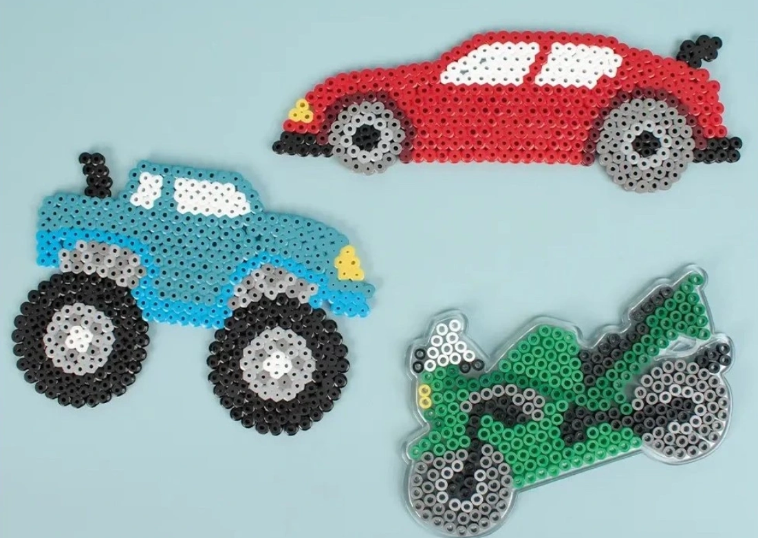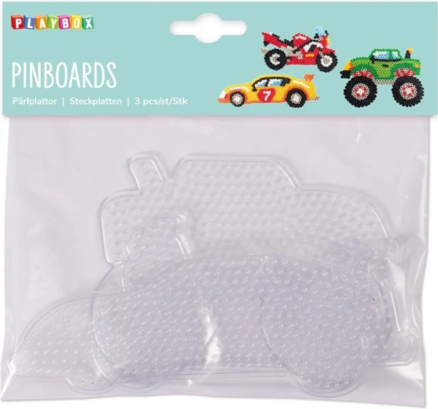 Átlátszó PLAYBOX alátétek 5 mm átmérőjű vasalható gyöngyökhöz, melyek megkönnyítik autós és egyéb motívumok készítését. Tartósak, többször használhatók, és az átlátszó kivitelnek köszönhetően könnyű a sablonokkal való munka otthon, iskolában és szakkörökben.