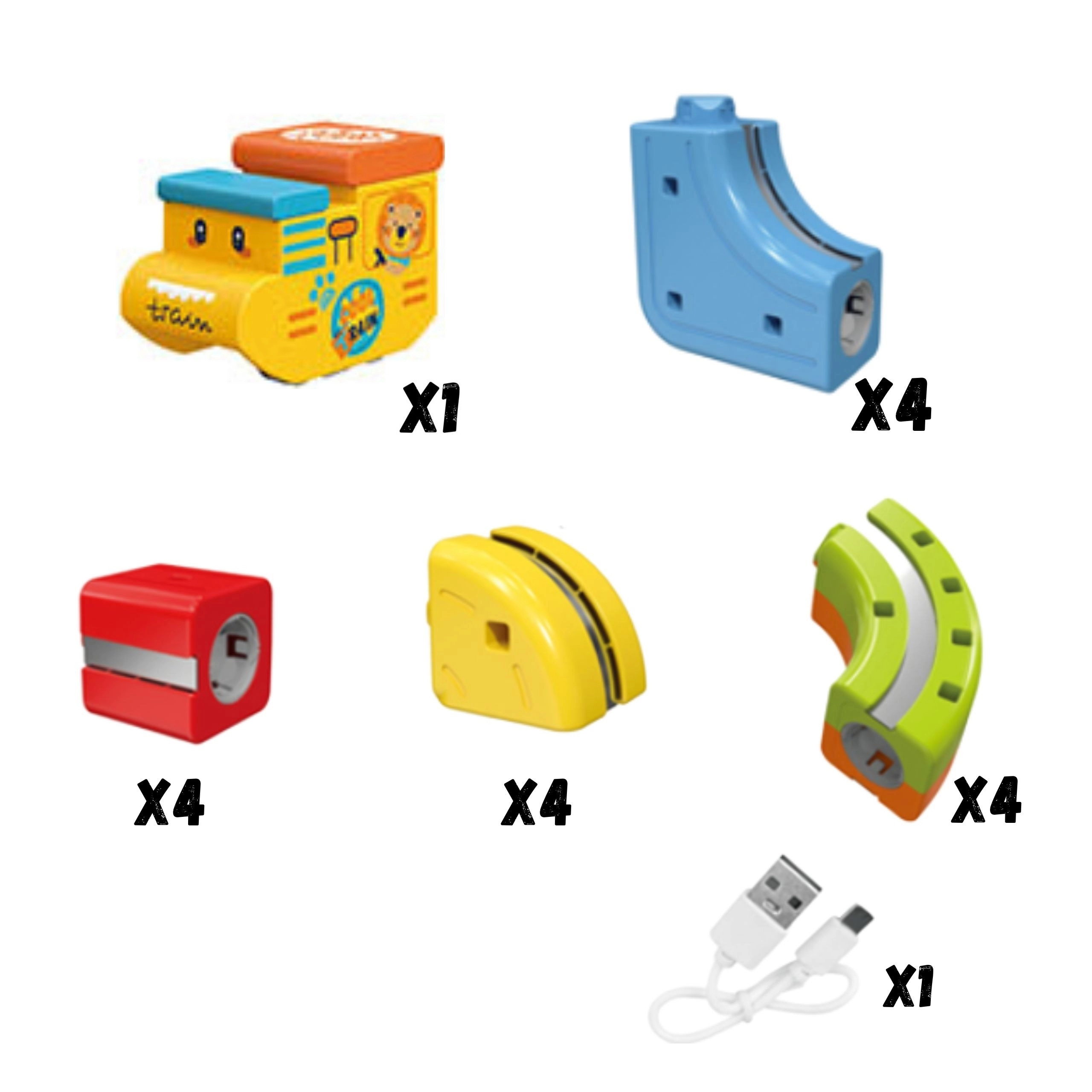 - 1× elektromos jármű, 4× kék pályaelem, 4× piros építőkocka, 4× zöld pályaelem, 4× sárga pályaelem, 1× USB-kábel