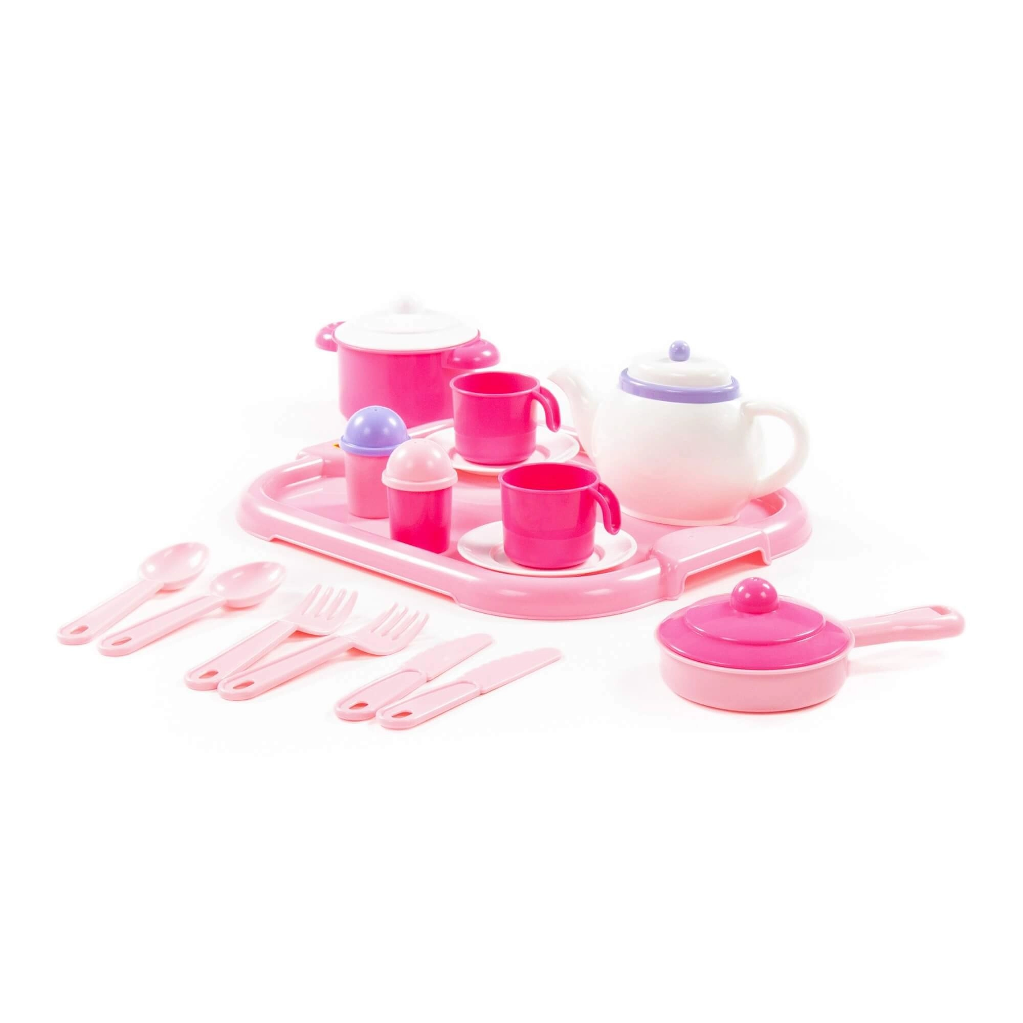 Ez a komplett gyermek étkészlet ideális a konyhás vagy éttermes szerepjátékhoz. Minden szükséges elemet tartalmaz két személy valósághű felszolgálásához és étkezéséhez, beleértve a praktikus tálcát az egyszerű hordozáshoz.