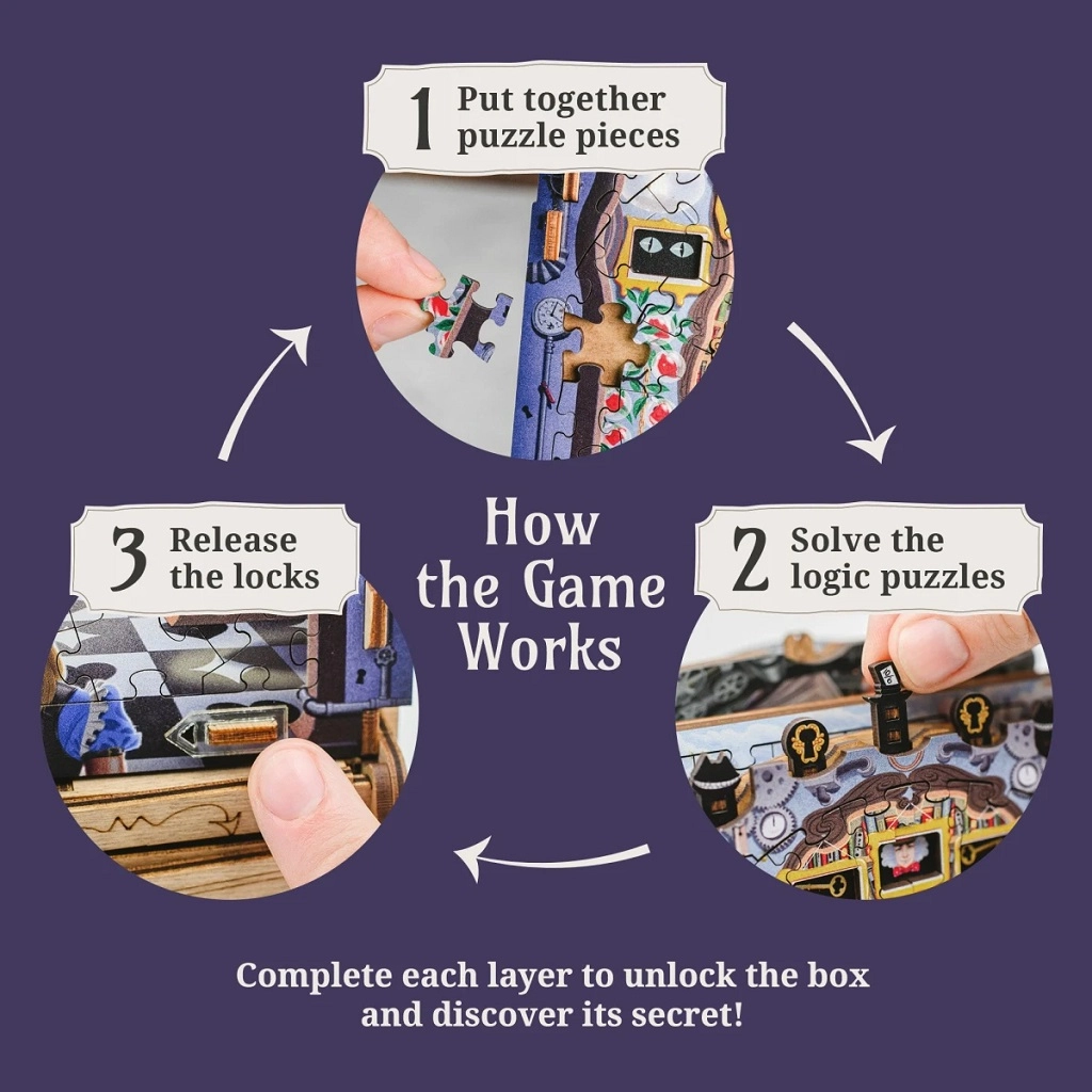 Az eredeti koncepció az illusztrált jelenetek kirakását rejtett nyomokkal és szabadulójáték-mechanikával egyesíti. Minden lépés közelebb visz a titokzatos doboz kinyitásához.