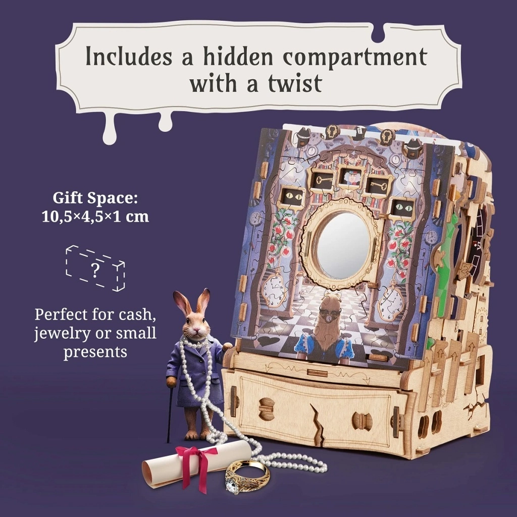 A rejtvények megoldása után egy gyönyörű fa dobozt kap titkos rekesszel apróságoknak – ideális ékszerekhez, bankjegyekhez vagy egyedi ajándékcsomagolásnak.