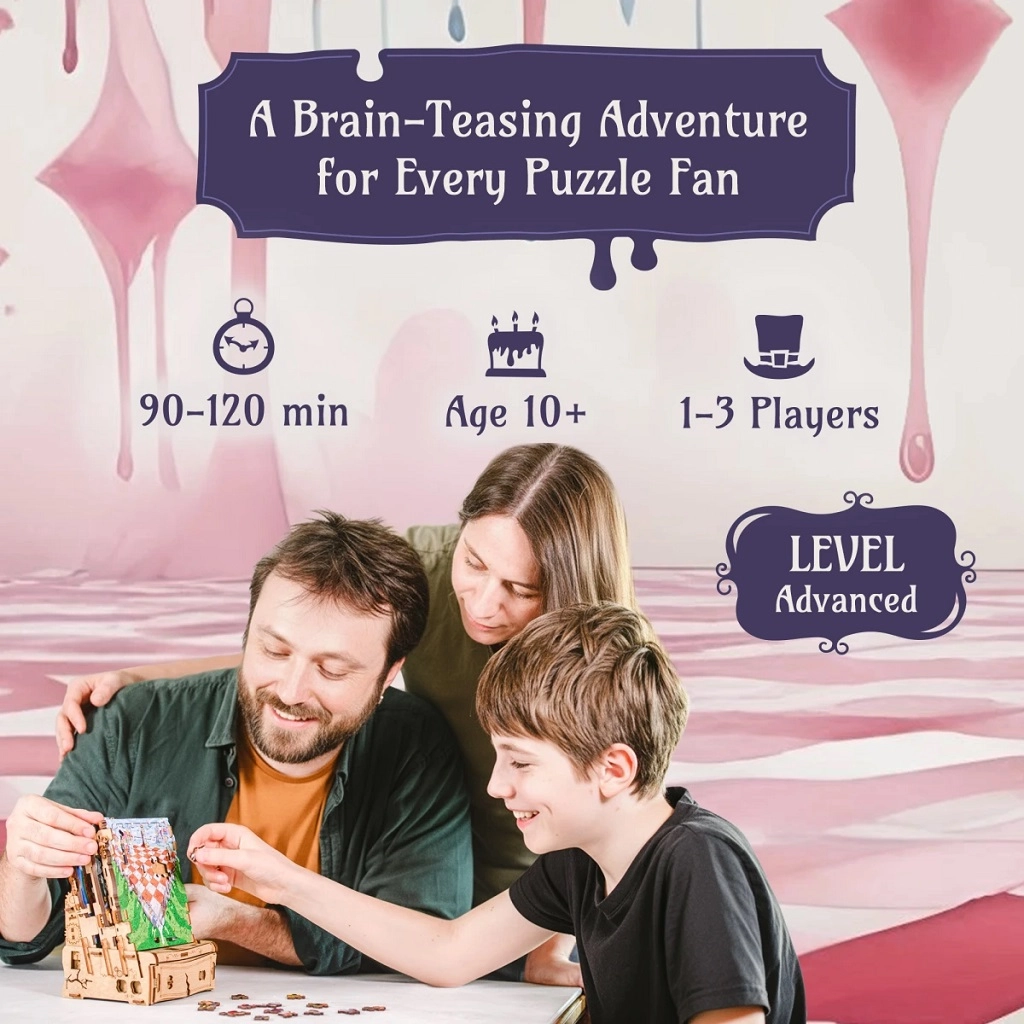 Fedezze fel a ALÍZ CSODAORSZÁGBAN világának varázsát ezzel az egyedi fa fejtörővel, amely ötvözi a kirakós puzzle és a szabadulójáték mechanikáit. Több mint 180 elem, 4 összekapcsolt motívum, logikai feladatok, rejtett nyomok és egy titkos rekesz egy apró meglepetésnek várja Önt. Ideális 1–3 játékos számára, 10 éves kortól, 90–120 perc játékidővel.