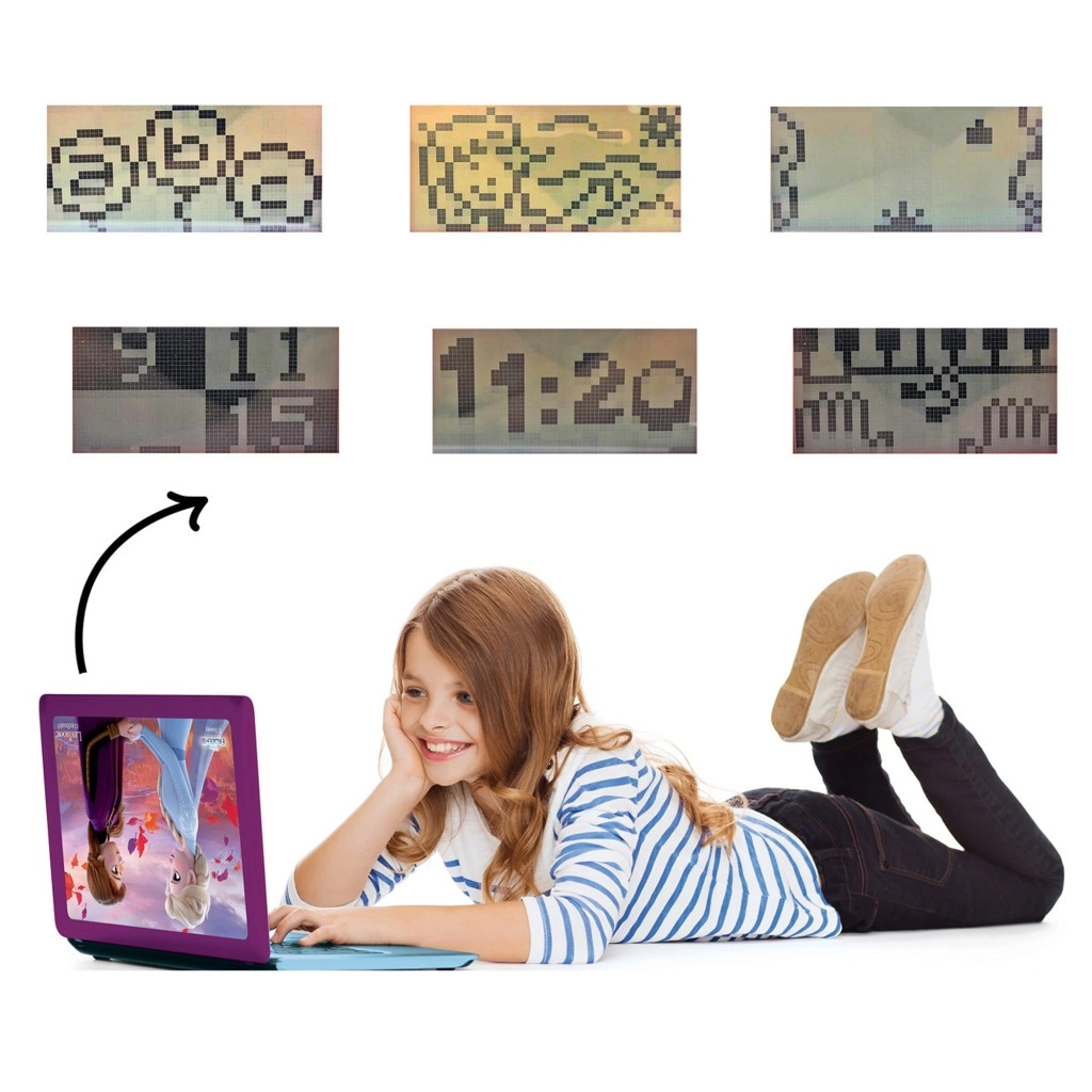 A kétnyelvű billentyűzet, a valódi egér és az áttekinthető, 5,1 × 9,7 cm-es LCD kijelző közelebb hozza a gyerekekhez egy igazi laptop használatát.