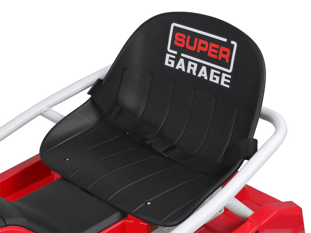 Merevített fém váz és deréktáji biztonsági öv tartja a gyereket a megfelelő pozícióban. Az alacsony ülés és az oldalsó védőívek növelik a stabilitást és a magabiztosságot a kormány mögött.