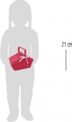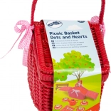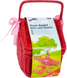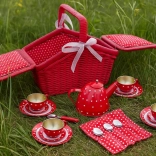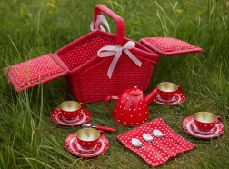Elbűvölő piknikkosár pöttyös és szívecskés motívumokkal, benne bádog teáskészlettel minden képzeletbeli teadélutánhoz. A masszív kivitel, az állítható tépőzáras pántok és a textil szegély könnyű hordozást és a darabok rendezett tárolását biztosítja. A gyerekek fejlesztik a társas interakciót, a motorikát és a kreativitást.