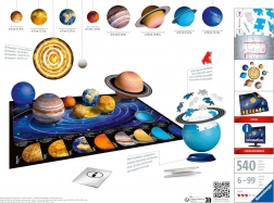 - 8 bolygó – puzzleball, 2 bolygógyűrű keménylemezből, Nap keménylemezből, Hold habosított polisztirolból, 8 talp, felfüggesztéshez nylon zsinór, kétoldalas poszter, képes útmutató