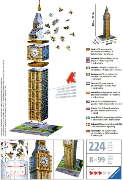 A készlet összesen 216 számozott puzzle darabból, 8 kiegészítő darabból és részletes útmutatóból áll. Az elkészült puzzle méretei körülbelül 18 x 18 x 41 cm. Ez a modell ideális mind a Ravensburger rajongói, mind az építészet és London szerelmesei számára.