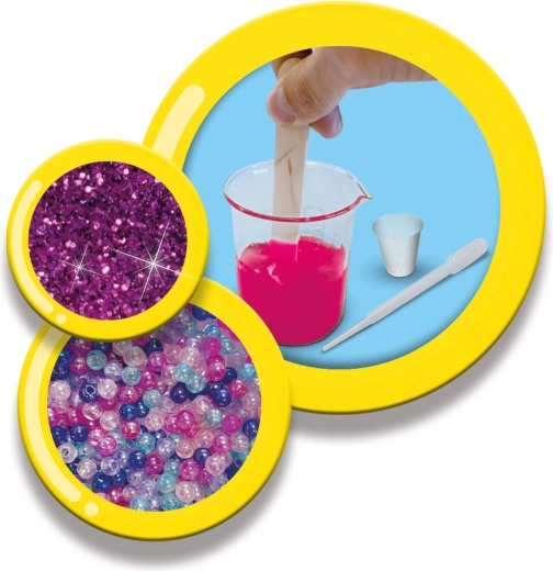 - 2 féle por slime készítéséhez, mérőpohár, spatula, pipetta, 3 szín, csillámok, gyöngyök, zárható tasak, használati útmutató