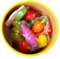 Ez a szeletelhető, fából készült gyümölcs- és zöldségkészlet élethű főzős, boltos vagy háztartási játékot kínál a gyerekeknek. Az elemeket tépőzár tartja össze, így a mellékelt késsel biztonságosan felvághatók, majd újra összekapcsolhatók. Az élénk színeknek és a kellemes fa kidolgozásnak köszönhetően fejlődik a finommotorika, a kéz–szem koordináció, és bővül a szókincs.