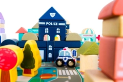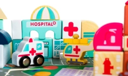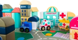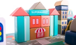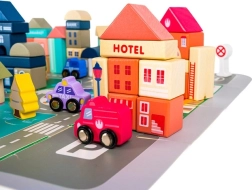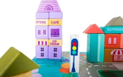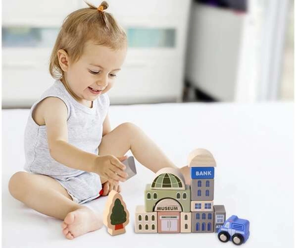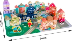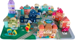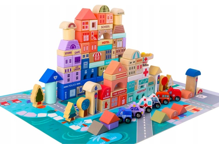 Ezek a fából készült városi építőkockák számtalan órányi izgalmas játékélményt nyújtanak a gyermekeknek. A készlet nagy méretű, tartalmaz 115 különféle kockát és 20 puzzle darabot, amely az utcák megjelenítésére szolgálnak. A kockák segítségével különböző lakó- és középületek, valamint járművek, fák, táblák és lámpaoszlopok építhetők fel, így a játék mindig leköti a gyerekek figyelmét.