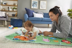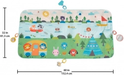 A kb. 152 × 81 cm-es szőnyeg elegendő helyet biztosít a guruláshoz, hasidőhöz és a közös játékhoz a szülőkkel. A színes kemping minta serkenti a fantáziát és a felfedezést.