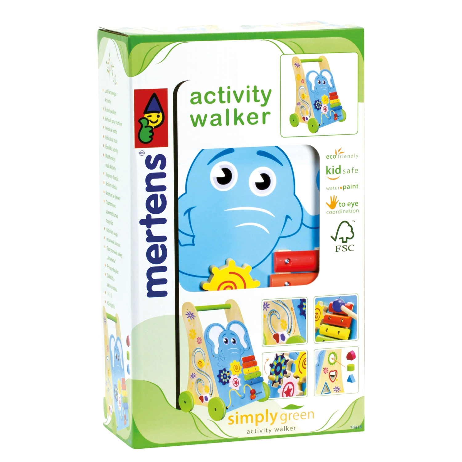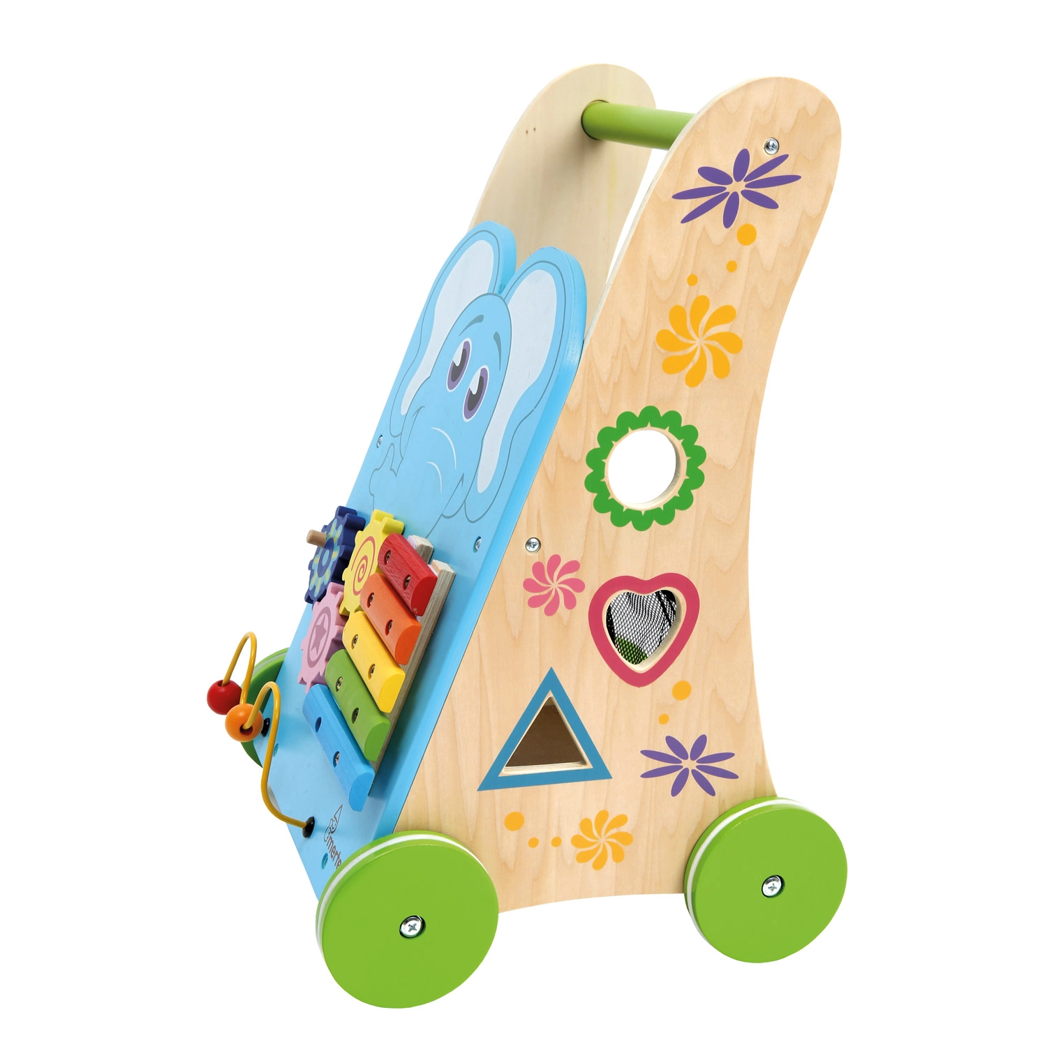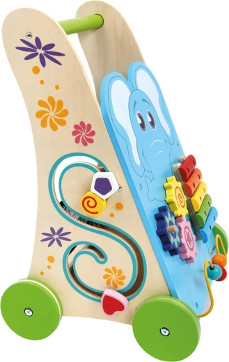 Támogasd kisgyermeked első lépéseit és sokoldalú fejlődését ezzel a stabil, tevékenységekkel ellátott fa járássegítővel. Tartalmaz egy lágy hangzású xilofont, gyöngy labirintust, formabedobót és fogaskerekeket az ok-okozati összefüggések felfedezéséhez. A gumírozott kerekek csendes futást és padlóvédelemet biztosítanak, a 100% FSC fa felhasználásával készült masszív felépítés biztonságos és tartós.