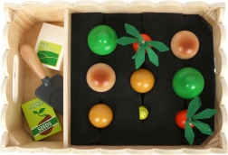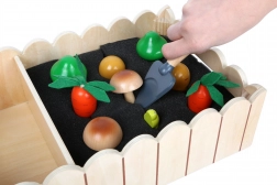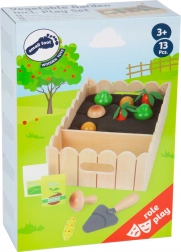 Figyelem, fiatal kertészek! Ez a zöldségágyás fa kerítéssel mindaz, amire a kis kertészek vágynak. A sárgarépa, gombák, burgonya és brokkoli mellett a készlet tartalmaz egy kis lapátot, műtrágyát és magokat is. Az ágyásban még egy hernyó is otthonra talált! A gyerekek megtanulják, hogyan kell elültetni a zöldségeket és hogyan kell gondozni őket a betakarítás előtt. Ez a játék fejleszti a finommotorikát és a képzelőerőt. 13 darab tartozékot tartalmaz