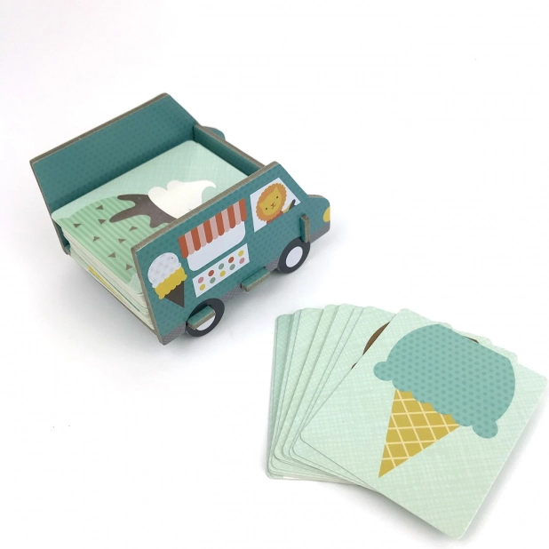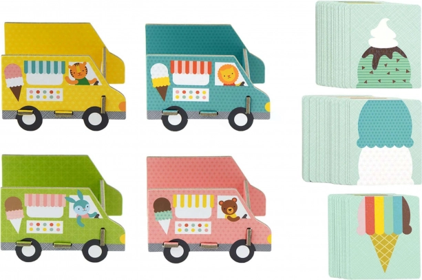 Édesszájúak, egyesüljetek! Okos és szórakoztató kártyajáték, amelyben fagyitölcséreket raksz össze, gombócokat gyűjtesz, és szórással díszítesz. Tartalmaz 52 illusztrált kártyát és 4 fagyis autót, ideális 2–4 játékos számára, körönként kb. 10 percig tart, és újrahasznosított anyagokból készül növényi alapú festékekkel. Remek választás 4–8 éves gyerekeknek, és megfelel minden biztonsági szabványnak.